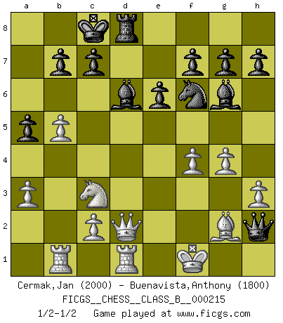 Last move : 1/2-1/2 2015 March 10 11:43:46 [Event "FICGS__CHESS__CLASS_B__000215"] [Site "FICGS"] [Date "2015.01.05"] [Round "1"] [White "Cermak,Jan"] [Black "Buenavista,Anthony"] [Result "1/2-1/2"] [WhiteElo "2000"] [BlackElo "1800"] 1.e4 d5 2.exd5 Qxd5 3.Nc3 Qd6 4.d4 Nf6 5.Nf3 a6 6.g3 Bg4 7.h3 Bh5 8.Bg2 Nc6 9.Bf4 Qb4 10.g4 Bg6 11.Qc1 O-O-O 12.a3 Qc4 13.Be3 Nxd4 14.Nxd4 Rxd4 15.Bxd4 Qxd4 16.O-O e6 17.Rd1 Qc5 18.Qd2 Bd6 19.b4 Qe5 20.Rab1 Qh2+ 21.Kf1 Rd8 22.b5 a5 23.f4 Qg3 24.Ne2 Qh2 25.Nc3 Qg3 26.Ne2 Qh2 27.Nc3 1/2-1/2 Scandinavian : Pytel-Wade variation Queenside Castling by player Black (move 11) Kingside Castling by player White (move 16) This chess game ended in a draw. Follow this game move after move (download)The older I grow, the more I value pawns. (Paul Keres) Auf jeden Fall musst du zuerst Rechtsanwalt werden, damit du deine eigenen Interessen und die deiner Familie vertreten kannst. [Brief an seinen Sohn] (José Raúl Capablanca) Fischer es una tragedia del Ajedrez Americano a la par con Morphy y Pillsbury. (Mig Greengard) Un millionnaire : 'Monsieur Steinitz ! Vous ne participez aux tournois que pour l'argent, alors que moi je n'y viens que pour l'honneur.' Steinitz : 'Chacun joue pour ce qu'il n'a pas'... Have no fear of perfection - you'll never reach it. (Salvador Dali)