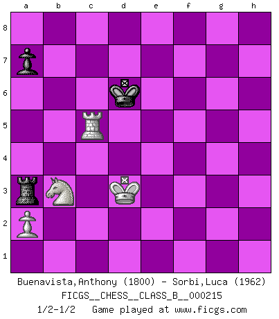 Last move : 1/2-1/2 2015 May 10 6:40:24 [Event "FICGS__CHESS__CLASS_B__000215"] [Site "FICGS"] [Date "2015.01.05"] [Round "1"] [White "Buenavista,Anthony"] [Black "Sorbi,Luca"] [Result "1/2-1/2"] [WhiteElo "1800"] [BlackElo "1962"] 1.e4 e5 2.Nf3 Nf6 3.Nc3 Nc6 4.Bc4 Bc5 5.d3 d6 6.Bg5 h6 7.Bxf6 Qxf6 8.Nd5 Qd8 9.c3 Ne7 10.d4 exd4 11.cxd4 Bb6 12.Ne3 O-O 13.O-O c6 14.Rc1 Ng6 15.d5 Re8 16.dxc6 bxc6 17.Nd4 Ne5 18.Be2 Bd7 19.Ndf5 d5 20.exd5 Bxf5 21.Nxf5 cxd5 22.b3 Rb8 23.Kh1 Qf6 24.Ng3 Bxf2 25.Qxd5 Rbd8 26.Qb5 Qb6 27.Nf5 Re6 28.Qxb6 Bxb6 29.Rfd1 Rxd1+ 30.Rxd1 Rf6 31.g4 h5 32.h3 hxg4 33.hxg4 Kf8 34.Kg2 Rc6 35.Rh1 f6 36.Bc4 Nxc4 37.bxc4 Bc5 38.Rh7 Rc7 39.Rh8+ Kf7 40.Kf3 Bf8 41.Ne3 Rc6 42.Ke4 Re6+ 43.Kd4 Re5 44.Kd3 Ra5 45.Rh2 g6 46.Nc2 f5 47.gxf5 gxf5 48.Nd4 Ra3+ 49.Nb3 Ke6 50.Re2+ Kd6 51.Rf2 Ke5 52.Re2+ Kd6 53.c5+ Kd5 54.Rf2 Bxc5 55.Rxf5+ Kd6 56.Rxc5 1/2-1/2 Petrov Three knights game Kingside Castling by player Black (move 12) Kingside Castling by player White (move 13) 10 pieces endgame at move 47 : White KRNPP , Black KRBPP WHITE : King + 1 Rook 1 Knight 2 Pawns BLACK : King + 1 Rook 1 Bishop 2 Pawns 9 pieces endgame at move 54 : White KRNP , Black KRBPP WHITE : King + 1 Rook 1 Knight 1 Pawn BLACK : King + 1 Rook 1 Bishop 2 Pawns 8 pieces endgame at move 55 : White KRNP , Black KRBP WHITE : King + 1 Rook 1 Knight 1 Pawn BLACK : King + 1 Rook 1 Bishop 1 Pawn 7 pieces endgame at move 56 : White KRNP , Black KRP WHITE : King + 1 Rook 1 Knight 1 Pawn BLACK : King + 1 Rook 1 Pawn This chess game ended in a draw. Follow this game move after move (download)My opponents make good moves too. Sometimes I don't take these things into consideration. (Bobby Fischer) Schach verlangt totale Konzentration. (Robert James Fischer) Todo lo que importa ante el tablero de Ajedrez son buenas jugadas. (Bobby Fischer) La vérité est comme le meilleur coup aux échecs : elle existe, mais il faut la chercher. (Arturo Perez-Reverte) Better than a thousand days of diligent study is one day with a great teacher. (Japanese proverb)