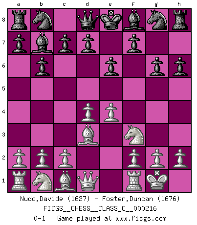 Last move : 0-1 2015 February 15 19:34:45 [Event "FICGS__CHESS__CLASS_C__000216"] [Site "FICGS"] [Date "2015.01.06"] [Round "1"] [White "Nudo,Davide"] [Black "Foster,Duncan"] [Result "0-1"] [WhiteElo "1627"] [BlackElo "1676"] 1.e4 e6 2.d4 b6 3.Nf3 Bb7 4.Bd3 h6 5.O-O g6 0-1 This chess game has been lost on time (started : 2015.01.06 11:42:13) French defense Kingside Castling by player White (move 5) Player Black won this chess game. Follow this game move after move (download)Chess is mental torture. (Garry Kasparov) Spielt Blackmar-Diemer-Gambit, und das Matt kommt von selbst! (Emil Joseph Diemer) No solamente yo pronostico su triunfo sobre Botvinnik, sino que me adelanto y digo que probablemente Fischer es el jugador de Ajedrez mas grande que haya existido. (John Collins) Demandez au pauvre Cg1 ce qu'il en pense. Eduard Gufeld à propos de la variante Saemisch de l'Est-Indienne. At work, the authority of a person is inversely proportional to the number of pens that person is carrying. (Dan Rotaru)