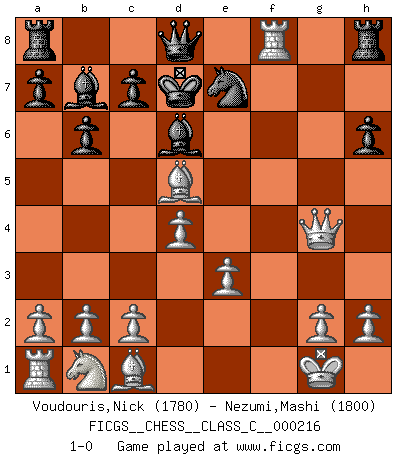 Last move : 1-0 2015 January 27 21:15:14 [Event "FICGS__CHESS__CLASS_C__000216"] [Site "FICGS"] [Date "2015.01.06"] [Round "1"] [White "Voudouris,Nick"] [Black "Nezumi,Mashi"] [Result "1-0"] [WhiteElo "1780"] [BlackElo "1800"] 1.d4 h6 2.f4 d5 3.e3 f5 4.Qh5+ Kd7 5.Qxf5+ e6 6.Qg4 Nf6 7.Qd1 Nc6 8.Nf3 Ne4 9.Bd3 g5 10.O-O g4 11.Bxe4 gxf3 12.Bxf3 b6 13.f5 exf5 14.Bxd5 Bb7 15.Rxf5 Bd6 16.Qg4 Ne7 17.Rf8 1-0 Queen's pawn Kingside Castling by player White (move 10) Player White won this chess game. Follow this game move after move (download)Different people feel differently about resigning. (Bobby Fischer) Weshalb minderdergeübte Spieler mit g2-g4 beginnen? Die betreffenden sind unschlüssig, ob sie nun rechts (h4) oder links (f4) beginnen sollen, und in ihrer Ratlosigkeit entschliessen sie sich nach guter Bürgerart dazu, den goldenen Mittelweg zu wählen. (Aaron Nimzowitsch) Cuando me preguntan: -¿Cual es el secreto que te hace hacer mejores movidas que tus oponentes?, Yo respondo: Me da gusto que me pregunten eso, porque, como veran, hay una simple razón. Yo pienso mis propias movidas y dejo a mi oponente que el piense las suyas. (Alexander Alekhine) Des idées, des idées, j'en ai cent, j'en ai mille. Des bonnes, des mauvaises, applicables, irréalisables... Il suffit de faire le tri ! (Roos) For to win one hundred victories in one hundred battles is not the acme of skill. To subdue the enemy without fighting is the acme of skill. (Sun Tzu)