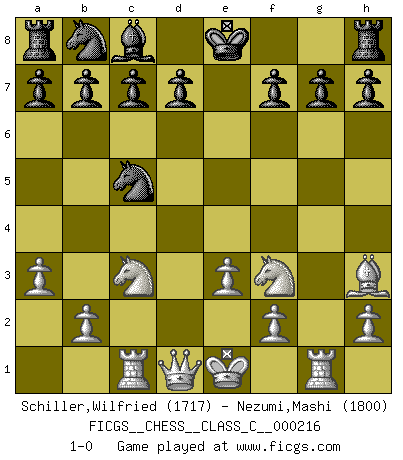 Last move : 1-0 2015 January 15 20:41:15 [Event "FICGS__CHESS__CLASS_C__000216"] [Site "FICGS"] [Date "2015.01.06"] [Round "1"] [White "Schiller,Wilfried"] [Black "Nezumi,Mashi"] [Result "1-0"] [WhiteElo "1717"] [BlackElo "1800"] 1.d4 Nf6 2.c4 e5 3.dxe5 Ne4 4.a3 Qh4 5.Be3 Bc5 6.Bxc5 Nxc5 7.Nc3 Qxc4 8.e3 Qe6 9.Rc1 Qxe5 10.Nf3 Qh5 11.g4 Qxg4 12.Rg1 Qh3 13.Bxh3 1-0 Budapest : Fajarowicz variation Player White won this chess game. Follow this game move after move (download)Chess, like love, is infectious at any age. (Flohr) Vielleicht wirkt die Aura früherer Spieler glanzvoller als die der heutigen Spieler, aber das liegt daran, dass man kein Programm wie Fritz hatte, das einem all die Löcher in ihren Partien zeigt. (Vladimir Kramnik) El muchacho (en ese entonces un niño de 12 años llamado Anatoly Karpov) no tiene ni idea de lo que es el Ajedrez y no hay futuro en absoluto para el en esta profesión. (Mikhail Botvinnik) 'L'échange des dames est un coup dur pour les deux adversaires...' Un journaliste lors d'une partie du match Spassky-Fischer Children in the dark cause accidents, accidents in the dark cause children. (Unknown)