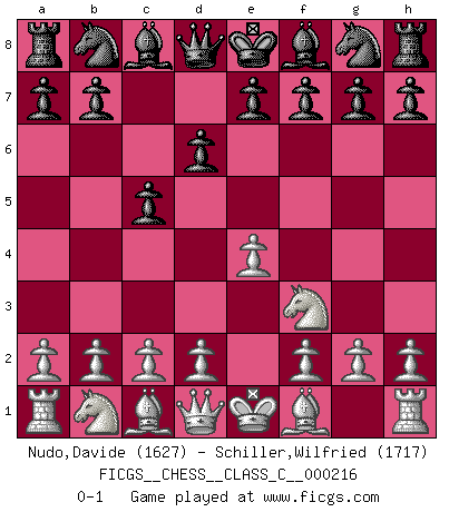 Last move : 0-1 2015 February 18 19:51:54 [Event "FICGS__CHESS__CLASS_C__000216"] [Site "FICGS"] [Date "2015.01.06"] [Round "1"] [White "Nudo,Davide"] [Black "Schiller,Wilfried"] [Result "0-1"] [WhiteElo "1627"] [BlackElo "1717"] 1.e4 c5 2.Nf3 d6 0-1 This chess game has been lost on time (started : 2015.01.06 11:42:13) Sicilian Player Black won this chess game. Follow this game move after move (download)Fischer was a master of clarity and a king of artful positioning. His opponents would see where he was going but were powerless to stop him. (Bruce Pandolfini) Bis jetzt ist Weiß einer wohlbekannten Analyse gefolgt. Aber jetzt begeht er einen schrecklichen Fehler: Er beginnt seinen eigenen Kopf zu benutzen. (Siegbert Tarrasch) Un mal día en el Ajedrez, es mejor que cualquier buen día en el trabajo. (Anonymous) Toutes choses étant égales, c'est la conviction qui gagne. Alliée à une volonté de vaincre, elle sert de détonateur, suscite des idées, disperse les doutes et aide à penser clairement. (Robert Fischer) Information on the Internet is subject to the same rules and regulations as conversation at a bar. (George Lundberg)