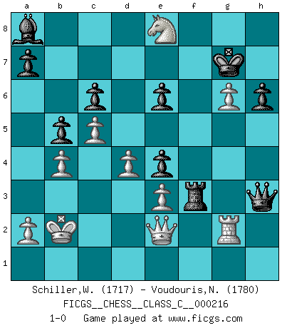 Last move : 1-0 2015 March 18 16:20:55 [Event "FICGS__CHESS__CLASS_C__000216"] [Site "FICGS"] [Date "2015.01.06"] [Round "1"] [White "Schiller,Wilfried"] [Black "Voudouris,Nick"] [Result "1-0"] [WhiteElo "1717"] [BlackElo "1780"] 1.d4 d5 2.c4 e6 3.Nf3 c6 4.Bf4 Bd6 5.Bxd6 Qxd6 6.e3 f5 7.Rg1 Nf6 8.Nc3 Nbd7 9.Qc2 Ne4 10.g4 O-O 11.gxf5 Nxc3 12.Qxc3 Rxf5 13.Rg3 Qf8 14.Be2 Nf6 15.Bd3 Ne4 16.Bxe4 dxe4 17.Ne5 Rxf2 18.O-O-O b5 19.R3g1 Bb7 20.c5 Qe7 21.Qe1 Raf8 22.Rd2 R2f5 23.b4 g6 24.Kb2 Qd8 25.Rg4 Rg5 26.Rdg2 Rxg4 27.Rxg4 Qf6 28.Rg2 Kg7 29.h4 Qf5 30.Qe2 Qh3 31.h5 Rf5 32.hxg6 h6 33.Nf7 Ba8 34.Nd6 Rf3 35.Ne8+ 1-0 Queen's gambit declined Kingside Castling by player Black (move 10) Queenside Castling by player White (move 18) Player White won this chess game. Follow this game move after move (download)Chess is a matter of delicate judgment, knowing when to punch and how to duck. (Bobby Fischer) Ich verlor meine Bürgerrechte, mein Gehalt wurde mir nicht mehr bezahlt und ich wurde zensiert und durfte nicht mehr ins Ausland reisen. [nach dem Match Fischer-Taimanov 6:0] (Mark Taimanov) El Ajedrez es un juego terrible. Si no dominas el centro, tu oponente tiene una posición mas libre. Si tu tienes el centro, entonces realmente tienes algo de que preocuparte. (Siegbert Tarrasch) Je menace de comprendre la position. (Anonyme) Perhaps the current trend of many chess professionals taking up the more lucrative pastime of poker is not a wholly negative one. It may not be too late for humans to relearn how to take risks in order to innovate and thereby maintain the advanced lifestyles we enjoy. And if it takes a poker-playing supercomputer to remind us that we can't enjoy the rewards without taking the risks, so be it. (The Chess Master and the Computer, by Garry Kasparov - 2010)