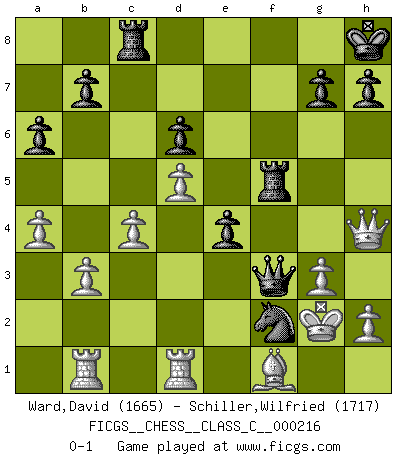 Last move : 0-1 2015 May 9 23:2:42 [Event "FICGS__CHESS__CLASS_C__000216"] [Site "FICGS"] [Date "2015.01.06"] [Round "1"] [White "Ward,David"] [Black "Schiller,Wilfried"] [Result "0-1"] [WhiteElo "1665"] [BlackElo "1717"] 1.e4 c5 2.Nf3 Nc6 3.d4 cxd4 4.Nxd4 Nf6 5.Nc3 e5 6.Ndb5 d6 7.a4 a6 8.Na3 Be7 9.Bg5 O-O 10.Bxf6 Bxf6 11.Bc4 Bg5 12.O-O Rb8 13.Nd5 Kh8 14.c3 f5 15.Bd3 Be6 16.Nc2 Bxd5 17.exd5 Ne7 18.c4 Ng6 19.Re1 Qb6 20.Rb1 e4 21.Bf1 Ne5 22.b3 Rbc8 23.Qd4 Qd8 24.Qd1 Bf4 25.Qh5 Qf6 26.Red1 Ng4 27.g3 Qc3 28.Nd4 Be3 29.fxe3 Qxe3+ 30.Kg2 Rf6 31.Nxf5 Qf3+ 32.Kg1 Rxf5 33.Qh4 Qe3+ 34.Kh1 Nf2+ 35.Kg2 Qf3+ 0-1 Sicilian : Pelikan (Lasker/Sveshnikov) variation Kingside Castling by player Black (move 9) Kingside Castling by player White (move 12) Player Black won this chess game. Follow this game move after move (download)What would Chess be without silly mistakes ? (Kurt Richter) Es hat in meinem Leben Zeiten gegeben, da ich sehr nahe daran war zu glauben, daß ich auch nicht eine einzige Schachpartie verlieren könnte. (José Raúl Capablanca) Los libros de Ajedrez deben de usarse igual como usamos los anteojos: para mejorar la vista, aunque algunos jugadores los quieren usar como si ellos les otorgaran la vision. (José Raúl Capablanca) Il vaut mieux sacrifier les pièces de l'adversaire. (Xavier Tartacover) Knowledge will give you power, but character respect. (Bruce Lee)