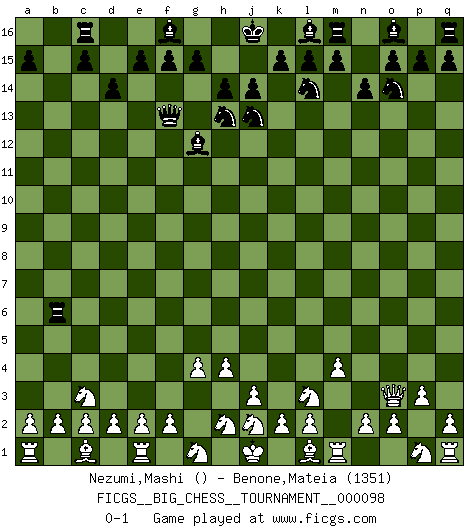 Last move : 0-1 2015 March 9 1:7:4 [Event "FICGS__BIG_CHESS__TOURNAMENT__000098"] [Site "FICGS"] [Date "2015.01.06"] [Round "1"] [White "Nezumi,Mashi"] [Black "Benone,Mateia"] [Result "0-1"] [WhiteElo ""] [BlackElo "1351"] 1.g2-g4 p16-o14 2.b1-c3 b16-c14 3.p2-p3 n15-n14 4.o1-p2 d15-d14 5.h1-c6 h15-j13 6.p2-c14 c16-h11 7.c6-l6 b15-c14 8.l6-c14 e16-c16 9.c14-l6 k16-l14 10.l6-f11 g16-f14 11.k1-l3 h11-g12 12.f11-o3 h16-h15 13.h3-h4 h15-f13 14.f1-l6 a16-b16 15.m2-m4 b16-b6 16.l6-n8 f14-h13 17.n8-h13 j15-h13 0-1 This big chess game has been lost on time (started : 2015.01.06 17:41:15) Follow this game move after move (download)By playing at Chess then, we may learn: First: Foresight... Second: Circumspection... Third: Caution... And lastly, we learn by Chess the habit of not being discouraged by present bad appearances in the state of our affairs, the habit of hoping for a favorable chance, and that of persevering in the secrets of resources. (Benjamin Franklin) Karpov ist ein Museumsstück. (Garry Kasparov) Desconfianza es la característica mas necesaria de un jugador de Ajedrez. (Siegbert Tarrasch) Si je n'étais pas joueur d'échecs, je serais le meilleur dans quelque chose d'autre. (Anatoli Karpov) I teach you to lie, cheat and steal, and as soon as my back's turned you wait in line ? (Gregory House, House M.D.)