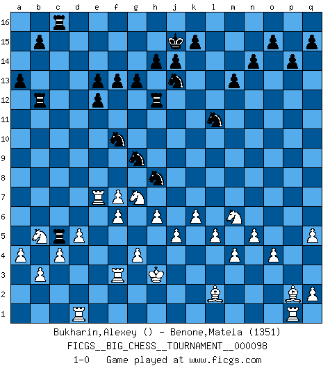 Last move : 1-0 2015 August 8 20:21:53 [Event "FICGS__BIG_CHESS__TOURNAMENT__000098"] [Site "FICGS"] [Date "2015.01.06"] [Round "1"] [White "Bukharin,Alexey"] [Black "Benone,Mateia"] [Result "1-0"] [WhiteElo ""] [BlackElo "1351"] 1.j2-k4 g15-g13 2.h1-o7 h16-f14 3.g1-f3 p16-o14 4.o7-l7 k16-l14 5.l7-c15 b16-c14 6.c15-g11 n15-n14 7.g11-l15 j15-k13 8.l15-d8 h15-j13 9.k1-l3 o16-g9 10.p1-q3 d15-d14 11.m2-m4 e15-e13 12.l1-p5 c16-q3 13.p2-q3 f14-f5 14.d8-g5 f5-g5 15.f3-g5 f15-f13 16.e2-e4 m15-m13 17.d2-d4 e13-e12 18.b2-b3 g16-f14 19.c1-a3 g9-a3 20.b1-a3 f14-g12 21.n2-n4 c14-e13 22.f2-f4 f16-g15 23.a3-b5 e16-c16 24.c2-c4 e13-f11 25.g2-g4 j13-h11 26.h3-h4 l14-j13 27.f1-m7 l16-m15 28.a1-d1 m16-l16 29.o1-p2 l16-l7 30.m7-o5 l7-p7 31.q3-q4 o14-n12 32.q1-p1 j16-j15 33.o2-o4 c16-c10 34.n4-n5 q16-c16 35.l3-n4 k13-l11 36.n4-m6 g15-e13 37.l2-l4 e13-a9 38.e4-e5 h11-k12 39.b5-d6 m15-f9 40.k2-k3 k12-h11 41.j1-j2 a9-d12 42.l4-l5 p7-a7 43.e1-e2 c10-a10 44.a2-a4 a10-b10 45.d6-b5 a7-j7 46.h2-j4 f9-d7 47.f4-f5 a15-a13 48.k4-h5 j7-j9 49.d4-d5 l11-m9 50.e5-e6 d7-e8 51.h5-g7 e8-a12 52.g5-f7 a12-f7 53.e6-f7 j9-j7 54.f5-f6 m9-l7 55.p5-l9 j7-j12 56.l9-k8 d12-e13 57.k8-e13 d14-e13 58.j2-h3 f11-e9 59.j4-g5 e9-d7 60.m1-f1 d7-c5 61.f1-f3 c16-c9 62.g5-e6 b10-b7 63.e6-c5 c9-c5 64.e2-e7 b7-b12 65.k3-k4 n12-l11 66.k4-k5 l7-k9 67.k5-k6 a16-c16 68.j3-j4 g12-f10 69.j4-j5 p15-p14 70.q4-q5 k9-h8 71.o5-l2 j12-h12 72.h4-h5 h11-g9 73.h5-h6 1-0 This big chess game has been lost on time (started : 2015.01.06 17:41:15) Follow this game move after move (download)I'm not afraid of Spassky. The world knows I'm the best. You don't need a match to prove it. (Bobby Fischer) Fischer: 'Remis!?' Uhlmann: 'Aber es muss doch dreimal Zugwiederholung sein!' Fischer: 'Sie nehmen das Remis an, wie ich es sage, sonst spiele ich weiter und werde Sie dann schlagen!' (Robert James Fischer) Uno por uno, yo los acribillé, mi superioridad muy pronto se volvio aparente. (Jose Capablanca) Les réformistes prétendent que les progrès de la théorie conduiront à la disparition des échecs, et qu'il faut, pour leur rendre vie, en remanier les règles. En réalité, qu'exprime cette affirmation? Le mépris de l'intuition, de l'imagination et de tous les autres éléments qui font des échecs un art. (Alexander Alekhine) Train yourself to let go of everything you fear to lose. (Master Yoda in Star Wars ep.3)