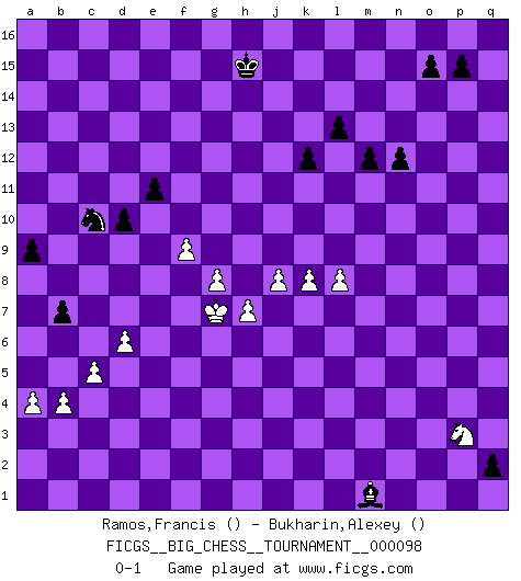 Last move : 0-1 2015 August 12 18:23:55 [Event "FICGS__BIG_CHESS__TOURNAMENT__000098"] [Site "FICGS"] [Date "2015.01.06"] [Round "1"] [White "Ramos,Francis"] [Black "Bukharin,Alexey"] [Result "0-1"] [WhiteElo ""] [BlackElo ""] 1.k2-k4 j15-k13 2.k1-l3 h16-o10 3.g2-g3 o10-o2 4.p1-o3 o2-f10 5.g1-f3 e15-e13 6.b1-c3 d15-d13 7.l1-k2 m15-m13 8.b2-b3 n15-n13 9.c1-b2 k16-l14 10.n2-n3 f16-a11 11.o1-k5 g16-f14 12.e2-e4 c16-g12 13.f1-b5 p16-o14 14.h1-f1 b16-c14 15.f1-c4 l16-n14 16.b5-k13 j14-k13 17.c4-a4 o16-e7 18.a4-k13 f10-j13 19.k13-j13 h15-j13 20.h3-h4 c14-d12 21.d2-d4 g12-e10 22.m2-m4 a16-d16 23.c3-d5 e7-g9 24.c2-c4 m13-m12 25.j3-j4 e10-k5 26.l3-k5 j13-h11 27.h4-h5 a11-k2 28.j1-k2 o14-n12 29.j2-h4 n12-l11 30.l2-l4 j16-h15 31.l4-l5 l14-j13 32.f3-g5 d12-e10 33.f2-f4 f14-g12 34.h2-g4 f15-f13 35.k2-j3 g15-g13 36.j4-j5 d16-d14 37.f4-f5 d14-a14 38.a2-a4 c15-c13 39.f5-f6 b15-b13 40.e4-e5 b13-b12 41.q1-o1 c13-c12 42.e5-e6 d13-d12 43.h4-g6 b12-b11 44.f6-f7 c12-c11 45.g4-f6 e13-e12 46.f6-h7 g9-h10 47.p2-p3 b11-b10 48.n3-n4 d12-d11 49.m4-m5 c11-c10 50.g3-g4 a14-b14 51.p3-p4 a15-a13 52.j5-j6 a13-a12 53.e6-e7 a12-a11 54.m1-f1 m16-f16 55.q2-q4 a11-a10 56.n4-n5 b10-b9 57.k5-h6 k15-k13 58.k4-k5 a10-a9 59.h6-g8 h10-e13 60.m5-m6 b9-b8 61.j3-j4 l15-l13 62.h5-h6 h11-g9 63.f7-f8 g9-h7 64.g5-h7 n14-g8 65.g6-j5 g8-n14 66.d5-f6 j13-h11 67.g4-g5 f16-j16 68.j4-h5 h11-j9 69.h7-j9 e13-j9 70.d4-d5 e12-e11 71.k5-k6 c10-c9 72.f8-f9 e10-g9 73.o1-o2 d11-d10 74.e7-e8 g9-f11 75.g5-g6 f11-e9 76.g6-g7 g12-f10 77.j5-h7 j9-k10 78.j6-j7 f10-g8 79.f6-g8 e9-g8 80.o3-m4 k10-q4 81.o2-o1 q4-k10 82.k6-k7 h14-h13 83.l5-l6 g13-g12 84.l6-l7 h13-h12 85.h7-k8 h12-h11 86.m4-l6 g12-g11 87.h6-h7 g8-e9 88.d5-d6 f13-f12 89.o1-o2 c9-c8 90.g7-g8 k10-b2 91.o2-b2 q15-q13 92.j7-j8 q13-q12 93.a1-d1 q12-q11 94.c4-c5 b8-b7 95.b3-b4 n14-m13 96.b2-q2 b14-p14 97.q2-q4 p14-p5 98.h5-h6 j16-j14 99.f1-q1 j14-o14 100.e1-e4 m13-p10 101.m6-m7 l11-j10 102.k8-j10 h11-j10 103.l6-k8 p5-n5 104.k8-j10 p10-m7 105.j10-k8 m7-p10 106.q4-q5 n5-q5 107.p4-q5 o14-o6 108.h6-g7 e16-e14 109.d1-o1 e14-o14 110.o1-n1 n13-n12 111.k8-h9 o6-o4 112.q1-q4 o4-q4 113.e4-q4 o14-o7 114.n1-l1 q16-q14 115.k7-k8 q14-o14 116.l7-l8 o7-o4 117.l1-l4 o4-l4 118.q4-l4 o14-o5 119.l4-q4 o5-j5 120.h9-j11 k13-k12 121.j11-h13 j5-j4 122.q4-j4 p10-j4 123.g7-f8 j4-n8 124.h13-f12 n8-q5 125.f12-e10 g11-g10 126.e10-c11 q5-n2 127.f8-g7 g10-f9 128.e8-f9 q11-q10 129.c11-d9 e9-c10 130.d9-e7 q10-q9 131.e7-c8 q9-q8 132.c8-e7 q8-q7 133.e7-g6 q7-q6 134.g6-j5 q6-q5 135.j5-k3 q5-q4 136.k3-m4 n2-m1 137.m4-o5 q4-q3 138.o5-p3 q3-q2 0-1 Follow this game move after move (download)Methodical thinking is of more use in Chess than inspiration. (C. J. S. Purdy) Schon mancher Spieler hat aufgegeben, um zu vermeiden, daß er eine Figur verliert. (Savielly Grigorievitsch Tartakower) El Ajedrez es como la guerra en un tablero. (Bobby Fischer) Les Echecs sont et restent toujours un combat, un combat intégral comme la boxe, la lutte ou un autre sport, et où il doit y avoir un vainqueur et un vaincu. (Joseph Emil Diemer) Indecision is the key to flexibility. (Unknown)