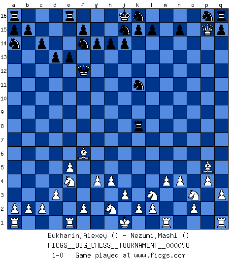 Last move : 1-0 2015 January 24 16:12:23 [Event "FICGS__BIG_CHESS__TOURNAMENT__000098"] [Site "FICGS"] [Date "2015.01.06"] [Round "1"] [White "Bukharin,Alexey"] [Black "Nezumi,Mashi"] [Result "1-0"] [WhiteElo ""] [BlackElo ""] 1.g2-g4 b16-a14 2.j2-k4 h15-g13 3.k1-l3 m15-m13 4.n2-n4 c15-c14 5.m2-m4 m16-m14 6.p1-o3 m13-m12 7.d2-d3 m14-m13 8.o1-g8 m13-o13 9.h3-h4 e15-e13 10.b1-c3 l16-n14 11.g8-n14 o15-n14 12.f1-q11 o13-j13 13.q11-n14 f16-b12 14.e2-e4 b12-k4 15.g1-j2 k4-d10 16.c1-g5 d10-l3 17.j2-l3 g15-g14 18.g5-d8 j13-j8 19.d8-f6 j8-f8 20.e4-e5 h16-f14 21.c3-e4 g13-j12 22.f6-m12 d15-d13 23.l1-p5 f14-f12 24.m12-f6 j12-l13 25.n14-c4 c16-p4 26.q2-q3 p4-q5 27.p2-p4 q5-k11 28.c4-k11 l13-k11 29.h1-o7 f8-k8 30.o7-o16 g16-f14 31.o16-p15 1-0 Follow this game move after move (download)Your body has to be in top condition. Your Chess deteriorates as your body does. You can't separate body from mind. (Bobby Fischer) Konzentriere dich auf materielle Gewinne. Nimm, was dir dein Gegner gibt, ausser es gibt einen guten Grund der dagegenspricht. (Robert James Fischer) Existen dos clases de sacrificios: los correctos y los míos. (Mikhail Tal) On n'a jamais que l'âge auquel on a commence à jouer aux échecs car après on cesse de vieillir. (Capablanca) When I took office, only high energy physicists had ever heard of what is called the World Wide Web... Now even my cat has its own page. (Bill Clinton, 1996)