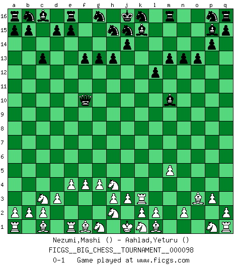 Last move : 0-1 2015 March 10 1:7:47 [Event "FICGS__BIG_CHESS__TOURNAMENT__000098"] [Site "FICGS"] [Date "2015.01.06"] [Round "1"] [White "Nezumi,Mashi"] [Black "Aahlad,Yeturu"] [Result "0-1"] [WhiteElo ""] [BlackElo ""] 1.p2-p3 p15-p14 2.g2-g4 o16-p15 3.b1-c3 f15-f13 4.o1-p2 n15-n13 5.f2-f4 m15-m13 6.e2-e4 g15-g13 7.j2-h4 o15-o13 8.d2-d3 l15-l13 9.h1-l4 l13-l12 10.l4-k4 c15-c13 11.m2-m4 h14-h13 12.m4-m5 h16-d12 13.m1-m3 d12-o2 14.p2-o3 o2-f10 15.m3-k3 f16-m10 16.k4-k15 l16-k15 0-1 This big chess game has been lost on time (started : 2015.01.06 17:41:15) Follow this game move after move (download)Only sissies Castle. (Rob Sillars) Wenn Du absolut nicht mehr weißt, was Du tun sollst, dann ist es Zeit für Panik. (John van der Wiel) Diferente gente reacciona diferentemente en aceptar la derrota. (Bobby Fischer) Si le désir cupide (et stupide) de gagner est une inépuisable source de souffrance, une combinaison brillante sur l'échiquier est une découverte : le coquelicot qui s'épanouit lorsque apparaît la Voie Lactée. (Arrabal) Nobody is always a winner, and anybody who says he is, is either a liar or doesn't play poker. (Amarillo Slim)