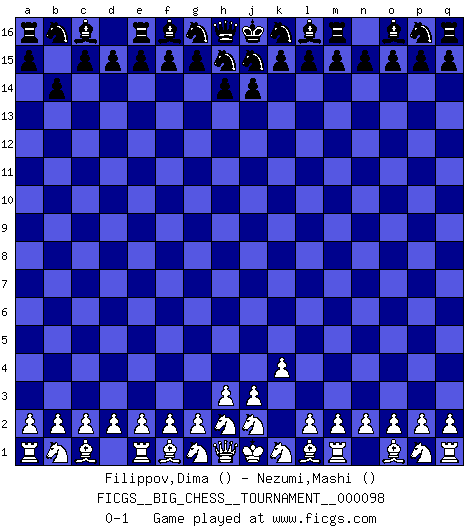 Last move : 0-1 2015 February 14 19:31:36 [Event "FICGS__BIG_CHESS__TOURNAMENT__000098"] [Site "FICGS"] [Date "2015.01.06"] [Round "1"] [White "Filippov,Dima"] [Black "Nezumi,Mashi"] [Result "0-1"] [WhiteElo ""] [BlackElo ""] 1.k2-k4 b15-b14 0-1 This big chess game has been lost on time (started : 2015.01.06 17:41:15) Follow this game move after move (download)Chess is life. (Bobby Fischer) Schachspieler können ausgezeichnet Varianten am Schachbrett berechnen, aber nicht im realen Leben. Zu stark ist der Individualismus im Schach ausgeprägt, und für viele ist ein kleiner momentaner persönlicher Vorteil wichtiger als ein weit größerer Vorteil von morgen. (Anatoly Karpov) Si yo gano un torneo, yo lo gano por mí mismo. Yo hago las jugadas. Nadie me ayuda. (Bobby Fischer) Shah mat. Le roi est mort. Cri de fierté d'un joueur venant de terrasser son adversaire, courtoisement, sans effusion de sang. Luck is when opportunity knocks and you answer. (Anonymous)