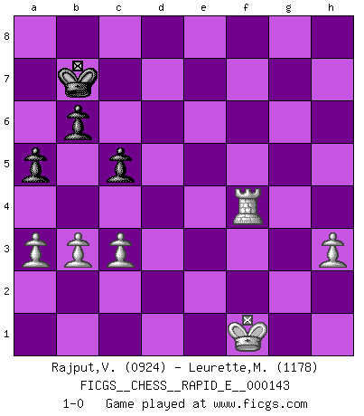 Last move : 1-0 2015 February 7 21:26:22 [Event "FICGS__CHESS__RAPID_E__000143"] [Site "FICGS"] [Date "2015.01.10"] [Round "1"] [White "Rajput,Vishalsingh"] [Black "Leurette,Marc-Antoine"] [Result "1-0"] [WhiteElo "0924"] [BlackElo "1178"] 1.e4 e5 2.Nf3 Nc6 3.Bc4 Nf6 4.d4 d6 5.dxe5 dxe5 6.Nc3 Qxd1+ 7.Nxd1 Bc5 8.Nc3 Bg4 9.Nd2 O-O-O 10.O-O Nd4 11.Bd3 h5 12.h3 Be6 13.Ne2 Nxe2+ 14.Bxe2 h4 15.Re1 g5 16.Nf3 Bd6 17.Nxg5 Rde8 18.Nxe6 Rxe6 19.Bc4 Bb4 20.Bxe6+ fxe6 21.c3 Bd6 22.f3 Nh5 23.Be3 Nf4 24.a3 Rg8 25.Bxf4 exf4 26.e5 Bc5+ 27.Kf1 Be3 28.Red1 a5 29.b3 Rg5 30.Rd3 Rxe5 31.Rad1 b6 32.Rd8+ Kb7 33.Rh8 Rc5 34.Rd3 e5 35.Rxh4 e4 36.fxe4 Re5 37.g3 Rxe4 38.gxf4 Bxf4 39.Rf3 c5 40.Rhxf4 Rxf4 41.Rxf4 1-0 Two knights defense Queenside Castling by player Black (move 9) Kingside Castling by player White (move 10) 10 pieces endgame at move 41 : White KRPPPP , Black KPPP WHITE : King + 1 Rook 4 Pawns BLACK : King + 3 Pawns Player White won this chess game. Follow this game move after move (download)Chess is a forcing house where the fruits of character can ripen more fully than in life. (Edward Morgan Foster) Ich könnte leicht behaupten: Ja,ja, Leonid Breschnew wollte nicht, daß ich Weltmeister werde. In der Tat war die Sache komplizierter. (Viktor Kortschnoi) Diferente gente reacciona diferentemente en aceptar la derrota. (Bobby Fischer) La vie et les Echecs sont tous les deux une lutte constante. (Lasker) A journey of a thousand sites begins with a single click. (Author unknown)
