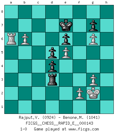 Last move : 1-0 2015 March 31 14:52:22 [Event "FICGS__CHESS__RAPID_E__000143"] [Site "FICGS"] [Date "2015.01.10"] [Round "1"] [White "Rajput,Vishalsingh"] [Black "Benone,Mateia"] [Result "1-0"] [WhiteElo "0924"] [BlackElo "1041"] 1.e4 e5 2.Nf3 Nf6 3.Nc3 Nc6 4.Bc4 Bc5 5.O-O O-O 6.h3 d6 7.a3 a6 8.Ba2 Be6 9.Bxe6 fxe6 10.Re1 Qe8 11.d3 b5 12.Be3 Bxe3 13.Rxe3 Nd4 14.Nd2 Qg6 15.Rg3 Qh6 16.Ne2 Nh5 17.Re3 Rf7 18.Nxd4 exd4 19.Rf3 Raf8 20.Rxf7 Rxf7 21.Nf3 c5 22.e5 d5 23.h4 Nf4 24.b4 Qg6 25.g3 Nh5 26.Ng5 Re7 27.Qd2 Qf5 28.Qe2 h6 29.Qxh5 hxg5 30.Qxg5 Qxg5 31.hxg5 c4 32.Kg2 cxd3 33.cxd3 Rc7 34.g6 Rc3 35.a4 bxa4 36.Rxa4 Kf8 37.Rxa6 Ke7 38.b5 Rxd3 39.b6 1-0 Petrov Three knights game Kingside Castling by player White (move 5) Kingside Castling by player Black (move 5) Player White won this chess game. Follow this game move after move (download)Bobby Fischer is the greatest Chess player who has ever lived. (Ken Smith) Wenn Du nicht kämpfst, um anderen etwas zu beweisen, sondern nur für Dich selbst, dann bist du fast unbesiegbar. (Garry Kasparov) Alguna parte de un error es siempre correcto. (Savielly Tartakover) Les Echecs ont trois composantes : le temps, l'espace et le matériel en dernier. (Mikhail Tal) There are two kinds of people in the world, my friend. Those who have a loaded gun and those who dig. You dig ! (Blondie in The Good, The Bad and The Ugly)