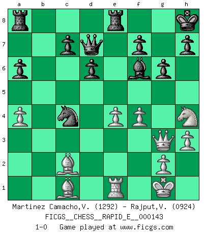Last move : 1-0 2015 March 25 3:5:8 [Event "FICGS__CHESS__RAPID_E__000143"] [Site "FICGS"] [Date "2015.01.10"] [Round "1"] [White "Martinez Camacho,Victor Hugo"] [Black "Rajput,Vishalsingh"] [Result "1-0"] [WhiteElo "1292"] [BlackElo "0924"] 1.e4 e5 2.Nf3 Nc6 3.Bb5 Nge7 4.O-O a6 5.Ba4 d6 6.h3 Be6 7.c3 b5 8.Bc2 Ng6 9.d3 Be7 10.Re1 O-O 11.Nbd2 Na7 12.d4 exd4 13.Nxd4 Qd7 14.Nxe6 Qxe6 15.Nb3 Rfe8 16.Nd4 Qd7 17.Nf5 Bf6 18.a4 Ne5 19.b3 bxa4 20.Rxa4 Nb5 21.c4 Nc3 22.Qd2 Nxa4 23.bxa4 Nxc4 24.Qf4 Be5 25.Qg4 Kh8 26.f4 Bf6 27.Qg3 g6 28.Nh4 1-0 This chess game has been lost on time (started : 2015.01.10 0:0:25) Ruy Lopez : Cozio defense Kingside Castling by player White (move 4) Kingside Castling by player Black (move 10) Player White won this chess game. Follow this game move after move (download)You know, comrade Pachman, I don't enjoy being a Minister, I would rather play Chess like you. (Che Guevara) Capablanka war das größte Genie der Schachgeschichte! Aber denken sie nicht er habe nichts vom Schach verstanden. Er wusste nur soviel wie er wissen musste um seine Ziele zu erreichen. (Mikhail Moiseyevich Botvinik) Del Ajedrez se ha dicho que la vida no es lo suficientemente larga para él, pero eso es culpa de la vida, no del Ajedrez. (William Ewart Napier) Le système Elo représente seulement une moyenne. Il est simplement un indicateur de votre stabilité. (Anatoli Karpov) Life is the sum of all your choices. (Albert Camus)