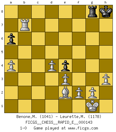 Last move : 1-0 2015 February 10 23:3:48 [Event "FICGS__CHESS__RAPID_E__000143"] [Site "FICGS"] [Date "2015.01.10"] [Round "1"] [White "Benone,Mateia"] [Black "Leurette,Marc-Antoine"] [Result "1-0"] [WhiteElo "1041"] [BlackElo "1178"] 1.Nf3 d5 2.d4 Nf6 3.c4 e6 4.Nc3 Bb4 5.Bg5 h6 6.Bxf6 Qxf6 7.e3 Bxc3+ 8.bxc3 c6 9.cxd5 cxd5 10.Bd3 Nc6 11.O-O a6 12.a4 O-O 13.Qb3 Na5 14.Qb4 Nc6 15.Qb6 Qd8 16.Qxd8 Rxd8 17.Rfb1 f6 18.h3 e5 19.dxe5 fxe5 20.Bg6 e4 21.Nd4 Rd6 22.Bh5 Na5 23.Be2 g6 24.Rb4 h5 25.Rab1 Rb8 26.Rb6 Rxb6 27.Rxb6 Bd7 28.Rxg6+ Kh7 29.Rg5 Rg8 30.Rxh5+ Kg7 31.Rxd5 Nc6 32.Rxd7+ Kh8 33.Rxb7 Nxd4 34.cxd4 1-0 Reti Opening Kingside Castling by player White (move 11) Kingside Castling by player Black (move 12) Player White won this chess game. Follow this game move after move (download)The sign of a great Master is his ability to win a won game quickly and painlessly. (Irving Chernev) Modernes Schach erfordert enorme Anspannung. Es ist für einen normalen Menschen unmöglich das auszuhalten. (Viktor Kortschnoi) La táctica fluye a partir de una posición superior. (Bobby Fischer) À la honte des hommes, on sait que les lois du jeu sont les seules qui soient partout justes, claires, inviolables et exécutées. Pourquoi l'Indien qui a donné les règles du jeu d'échecs est-il obéi de bon gré dans toute la terre, et que les décrétales des papes, par exemple, sont aujourd'hui un objet d'horreur et de mépris ? C'est que l'inventeur des échecs combina tout avec justesse pour la satisfaction des joueurs, et que les papes, dans leurs décrétales, n'eurent en vue que leur seul avantage. L'Indien voulut exercer également l'esprit des hommes et leur donner du plaisir; les papes ont voulu abrutir l'esprit des hommes. Voltaire (Dictionnaire philosophique / Garnier 1967) . 'gn is not allowed in chess unless n is an integer between 1 and 8 inclusive, where 1 and 8 are to interpreted as the standard numerals standing for integers in the ordered real-closed field R, with the *canonical* ordering. (As opposed to, say, an integer in the domain Z[2+i*sqrt(5)] or an integer in some exotic Grothendieck topos). (Normajean Yates)
