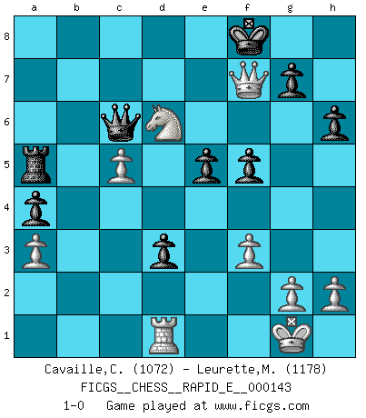 Last move : 1-0 2015 January 18 20:24:51 [Event "FICGS__CHESS__RAPID_E__000143"] [Site "FICGS"] [Date "2015.01.10"] [Round "1"] [White "Cavaille,Cedric"] [Black "Leurette,Marc-Antoine"] [Result "1-0"] [WhiteElo "1072"] [BlackElo "1178"] 1.d4 d5 2.Nf3 b6 3.e3 Bb7 4.c4 e6 5.Bd2 Nf6 6.Nc3 Bd6 7.a3 c5 8.Rb1 cxd4 9.exd4 O-O 10.Be2 Qe7 11.Bg5 Nbd7 12.O-O h6 13.Bxf6 Nxf6 14.b4 a5 15.c5 bxc5 16.bxc5 Bb8 17.Qb3 Bc6 18.Ne5 Bxe5 19.dxe5 a4 20.exf6 Qxf6 21.Qc2 e5 22.Bb5 d4 23.Bxc6 Qxc6 24.Ne4 Rfd8 25.f3 d3 26.Qc3 Rd4 27.Rb4 Rxb4 28.Qxb4 f5 29.Qc4+ Kf8 30.Nd6 Ra7 31.Rd1 Ra5 32.Qf7+ 1-0 Queen's pawn game Kingside Castling by player Black (move 9) Kingside Castling by player White (move 12) Player White won this chess game. Follow this game move after move (download)The boy (then a 12 year old boy named Anatoly Karpov) doesn't have a clue about Chess, and there's no future at all for him in this profession. (Mikhail Botvinnik) Bis jetzt ist Weiß einer wohlbekannten Analyse gefolgt. Aber jetzt begeht er einen schrecklichen Fehler: Er beginnt seinen eigenen Kopf zu benutzen. (Siegbert Tarrasch) La captura del Rey enemigo es la finalidad pero no el primer objetivo de la partida. (William Steinitz) Vous savez, camarade Pachman, je n'éprouve pas de plaisir à être ministre, je jouerais plutôt aux échecs comme vous, ou alors ferais une révolution au Venezuela. (Che Guevara à Ludek Pachman, 'Checkmate in Prague', 1975) I take risks, sometimes patients die, but not taking risks causes more patients to die. So I guess my biggest problem is I've been cursed with the ability to do the math. (Gregory House, House M.D.)