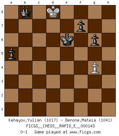 Last move : 0-1 2015 March 9 9:54:13 [Event "FICGS__CHESS__RAPID_E__000143"] [Site "FICGS"] [Date "2015.01.10"] [Round "1"] [White "Kehayov,Yulian"] [Black "Benone,Mateia"] [Result "0-1"] [WhiteElo "1017"] [BlackElo "1041"] 1.e4 e5 2.Nf3 Nf6 3.Nxe5 d6 4.Nf3 Nxe4 5.d3 Nf6 6.Be2 Nc6 7.O-O Be7 8.c4 O-O 9.h3 h6 10.b3 Bf5 11.Bb2 Qd7 12.Nc3 Rae8 13.d4 d5 14.c5 Ne4 15.Nxe4 Bxe4 16.Nd2 Bg6 17.Nf3 Qe6 18.Bd3 Bxd3 19.Qxd3 Nb4 20.Qd2 a5 21.a3 Nc6 22.Rfe1 Qf6 23.Rab1 Bd8 24.Rxe8 Rxe8 25.Re1 Rxe1+ 26.Qxe1 Qe7 27.Qxe7 Bxe7 28.Ne5 Nxe5 29.dxe5 Bxc5 30.Kf1 g6 31.g3 Kf8 32.Ke2 Ke7 33.f4 h5 34.g4 hxg4 35.hxg4 Ke6 36.Kd3 b5 37.Ke2 Be7 38.Kd3 c5 39.Ke2 d4 40.Kd3 Kd5 41.Ba1 c4+ 42.bxc4+ bxc4+ 43.Kd2 Bxa3 44.Kc2 d3+ 45.Kd2 Bb4+ 46.Bc3 Bxc3+ 47.Kxc3 Ke4 48.Kxc4 d2 49.Kc5 d1Q 50.Kb5 Qd2 51.Kc5 Qb4+ 52.Kc6 Kxf4 53.Kd7 Kxe5 54.Ke8 Ke6 55.Kd8 Qb8+ 0-1 Petrov : French attack Kingside Castling by player White (move 7) Kingside Castling by player Black (move 8) 10 pieces endgame at move 47 : White KPPP , Black KPPPPP WHITE : King + 3 Pawns BLACK : King + 5 Pawns 9 pieces endgame at move 48 : White KPPP , Black KPPPP WHITE : King + 3 Pawns BLACK : King + 4 Pawns Promotion Queen by player Black (move 49) 8 pieces endgame at move 52 : White KPP , Black KQPPP WHITE : King + 2 Pawns BLACK : King + 1 Queen 3 Pawns 7 pieces endgame at move 53 : White KP , Black KQPPP WHITE : King + 1 Pawn BLACK : King + 1 Queen 3 Pawns Player Black won this chess game. Follow this game move after move (download)Openings teach you openings. Endgames teach you chess ! (Stephan Gerzadowicz) Es ist besser die Steine des Gegners zu opfern. (Savielly Grigorievitsch Tartakower) Aún el Rey más flojo huye despavorido ante la amenaza de un Jaque doble. (Aaron Nimzowitsch) Shah mat. Le roi est mort. Cri de fierté d'un joueur venant de terrasser son adversaire, courtoisement, sans effusion de sang. This is where the fun begins. (Anakin Skywalker in Star Wars ep.3)