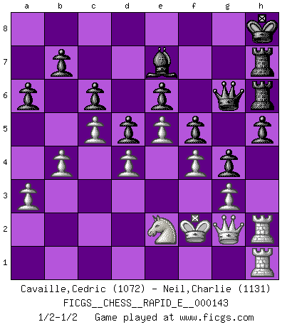 Last move : 1/2-1/2 2015 February 7 17:11:20 [Event "FICGS__CHESS__RAPID_E__000143"] [Site "FICGS"] [Date "2015.01.10"] [Round "1"] [White "Cavaille,Cedric"] [Black "Neil,Charlie"] [Result "1/2-1/2"] [WhiteElo "1072"] [BlackElo "1131"] 1.d4 d5 2.Nf3 Nf6 3.e3 Bf5 4.Bd3 Bxd3 5.Qxd3 e6 6.O-O Bd6 7.c4 c6 8.c5 Bc7 9.h3 Nbd7 10.b4 a6 11.Nc3 O-O 12.Re1 Re8 13.e4 Kh8 14.e5 Ng8 15.Ng5 f5 16.Qf3 Nf8 17.Ne2 Re7 18.h4 Nh6 19.Nh3 Qe8 20.Bxh6 gxh6 21.Nef4 Ng6 22.Qg3 Rg7 23.Re3 Bd8 24.Qh2 Bxh4 25.Nxg6+ hxg6 26.g3 Be7 27.f3 Qf7 28.f4 Rag8 29.Kf2 g5 30.Rh1 g4 31.Ng1 Rg6 32.Re1 Bf8 33.Ne2 R8g7 34.Qg2 Rh7 35.Rh2 h5 36.Reh1 Rgh6 37.Ng1 Be7 38.Ne2 Qg6 39.a3 1/2-1/2 Queen's pawn game Kingside Castling by player White (move 6) Kingside Castling by player Black (move 11) This chess game ended in a draw. Follow this game move after move (download)When you don't know what to play, wait for an idea to come into your opponent's mind. You may be sure that idea will be wrong. (Siegbert Tarrasch) Zeige mir drei Eröffnungsvarianten und ich beweise dir, dass zwei davon inkorrekt sind. (Emanuel Lasker) El Ajedrez es realmente noventa y nueve por ciento calculación. (Soltis) Le pion, dans sa simplicité, marche droit devant lui, mais lorsqu'il prend, il le fait obliquement? Ainsi l'homme, tant qu'il reste pauvre, marche dans la droiture et vit honnêtement, mais lorsqu'il recherche les honneurs, il flatte, se parjure et, par les voies obliques, cherche une position supérieure sur l'échiquier du monde. (Jean de Galles) Ah, the Socrating method. The best way we have of teaching everything-apart from juggling chainsaws. (Gregory House, House M.D.)