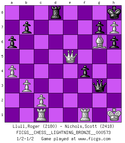 Last move : 1/2-1/2 2015 January 10 12:46:11 [Event "FICGS__CHESS__LIGHTNING_BRONZE__000573"] [Site "FICGS"] [Date "2015.01.10"] [Round "1"] [White "Llull,Roger"] [Black "Nichols,Scott"] [Result "1/2-1/2"] [WhiteElo "2180"] [BlackElo "2418"] 1.e4 c5 2.Nc3 Nc6 3.Nge2 e6 4.d4 cxd4 5.Nxd4 Nf6 6.Be3 d6 7.Be2 Be7 8.O-O O-O 9.Qd2 a6 10.a4 Qc7 11.f4 Na5 12.Qd3 Bd7 13.g4 h6 14.h4 d5 15.e5 Nh7 16.g5 Nc4 17.Bc1 Bc5 18.Kg2 Rac8 19.Bg4 Bxd4 20.Qxd4 Kh8 21.Qf2 Rg8 22.Kh1 f6 23.g6 fxe5 24.gxh7 Rgf8 25.b3 Nd6 26.Ne2 d4 27.Ba3 Rf6 28.Bxd6 Qxd6 29.Rac1 exf4 30.Qxd4 Qc7 31.Qd3 Bc6+ 32.Bf3 e5 33.Nc3 Rd6 34.Qf5 Qd8 35.Ne4 Bxe4 36.Bxe4 Qxh4+ 37.Kg1 Rcd8 38.Qxe5 Rg6+ 39.Bxg6 Qg3+ 40.Kh1 1/2-1/2 Sicilian : chameleon variation Kingside Castling by player White (move 8) Kingside Castling by player Black (move 8) This chess game ended in a draw. Follow this game move after move (download)Don't even mention losing to me. I can't stand to think of it. (Bobby Fischer) Ich habe kein Problem mit Frauen, sondern nur mit dem Niveau ihres Schachspiels (Judith Polgar) El Ajedrez es de 30 a 40 por ciento psicología. Uno no cuenta con esto cuando se juega contra una computadora. No lo puedo confundir. (Judith Polgar) Seul un grand joueur sait à quel point il joue faiblement. (Xavier Tartacover) There are more things in heaven and earth than practically anywhere else. (Unknown)
