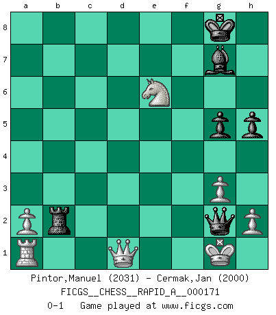 Last move : 0-1 2015 January 27 10:26:22 [Event "FICGS__CHESS__RAPID_A__000171"] [Site "FICGS"] [Date "2015.01.13"] [Round "1"] [White "Pintor,Manuel"] [Black "Cermak,Jan"] [Result "0-1"] [WhiteElo "2031"] [BlackElo "2000"] 1.e4 c5 2.Nc3 Nc6 3.g3 g6 4.Bg2 Bg7 5.d3 d6 6.f4 e6 7.Nf3 Nge7 8.O-O O-O 9.Be3 Nd4 10.e5 Bd7 11.Nxd4 cxd4 12.Bxd4 Nf5 13.Bf2 dxe5 14.fxe5 Bxe5 15.d4 Bg7 16.d5 h5 17.dxe6 Bxe6 18.Bxb7 Rb8 19.Bd5 Rxb2 20.Bxe6 fxe6 21.Ne2 g5 22.Bxa7 Qa8 23.Bd4 Nxd4 24.Rxf8+ Qxf8 25.Nxd4 Qc5 26.c3 Qxc3 27.Nxe6 Qe3+ 28.Kh1 Qe4+ 29.Kg1 Qg2+ 0-1 Sicilian : Closed, 6.f4 Kingside Castling by player White (move 8) Kingside Castling by player Black (move 8) Player Black won this chess game. Follow this game move after move (download)The tactician knows what to do when there is something to do; whereas the strategian knows what to do when there is nothing to do. (Gerald Abrahams) Mit sehr nachdenklichem Gesicht schreitet Bobby durch den Turniersaal. Was ist passiert?, fragt Lombardy. Ich stehe schlecht, antwortet Fischer. Lombardy: Dann biete doch einfach Remis an. Fischer: So schlecht stehe ich nun auch wieder nicht! (Robert James Fischer) El Ajedrez es la vida. (Bobby Fischer) Les Echecs ont trois composantes : le temps, l'espace et le matériel en dernier. (Mikhail Tal) Now be brave and don't look back. Don't look back. (Shmi Skywalker in Star Wars ep.1)