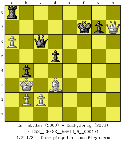 Last move : 1/2-1/2 2015 February 9 12:42:23 [Event "FICGS__CHESS__RAPID_A__000171"] [Site "FICGS"] [Date "2015.01.13"] [Round "1"] [White "Cermak,Jan"] [Black "Dusk,Jerzy"] [Result "1/2-1/2"] [WhiteElo "2000"] [BlackElo "2073"] 1.e4 c5 2.Nf3 d6 3.d4 cxd4 4.Nxd4 Nf6 5.Nc3 a6 6.Be3 e5 7.Nb3 Be6 8.f3 Be7 9.Qd2 O-O 10.O-O-O Nbd7 11.g4 b5 12.g5 Nh5 13.Kb1 Nb6 14.Nd5 Nxd5 15.exd5 Bf5 16.Na5 Qd7 17.Nc6 f6 18.h4 Bd8 19.Rh2 Bc7 20.Qb4 Qf7 21.Qa3 Bd7 22.Bd3 f5 23.Qb3 Kh8 24.Rg2 Qe8 25.Qc3 Bd8 26.a3 Rc8 27.a4 Bxc6 28.dxc6 b4 29.Qc4 Qxc6 30.Qxa6 Qxf3 31.Rf1 Qxg2 32.Qxc8 Ng3 33.Rc1 f4 34.Bb6 e4 35.Bb5 Qd2 36.Bxd8 f3 37.Qg4 Ne2 38.Rf1 Rxd8 39.Qxe4 Ng3 40.Qxf3 Nxf1 41.Qxf1 Qd4 42.Qf5 Qxh4 43.Bd3 d5 44.Ka2 Kg8 45.Kb3 h6 46.gxh6 Qxh6 47.a5 Qd6 48.a6 Ra8 49.Qh5 Rd8 50.Bg6 Qc6 51.Qh7+ Kf8 52.Qh4 Ra8 53.Bd3 Kg8 54.Qh7+ Kf7 1/2-1/2 Sicilian : Najdorf, Byrne (English) attack Kingside Castling by player Black (move 9) Queenside Castling by player White (move 10) This chess game ended in a draw. Follow this game move after move (download)The defensive power of a pinned piece is only imaginary. (Aaron Nimzovich) Frage: Wie viele Autos haben Sie schon zerstört? - Antwort: Nur zwei. (Loek van Wely) Muchos jugadores de Ajedrez se sorprendían cuando después de la partida, Fischer explicaba con calma: 'Yo ya había analizado esta posibilidad' en una posición en la cual yo creía que no era posible de prever desde la apertura. (Mikhail Tal) Soyez une menace à chaque fois que vous vous asseyez pour jouer. (Ken Smith) Every now and then a man's mind is stretched by a new idea and never shrinks back to its former dimensions. (Oliver Wendell Holmes, Sr.)