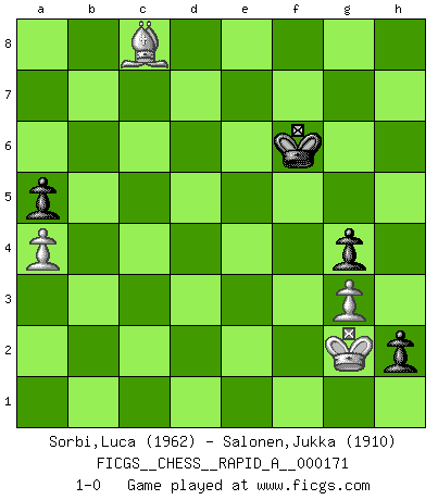 Last move : 1-0 2015 April 6 16:32:6 [Event "FICGS__CHESS__RAPID_A__000171"] [Site "FICGS"] [Date "2015.01.13"] [Round "1"] [White "Sorbi,Luca"] [Black "Salonen,Jukka"] [Result "1-0"] [WhiteElo "1962"] [BlackElo "1910"] 1.e4 e5 2.Nf3 Nc6 3.Bb5 a6 4.Ba4 Nf6 5.O-O Nxe4 6.d4 b5 7.Bb3 d5 8.dxe5 Be6 9.c3 Be7 10.Nbd2 O-O 11.Bc2 f5 12.Nb3 Qd7 13.Nfd4 Nxd4 14.Nxd4 c5 15.Nxe6 Qxe6 16.f3 Ng5 17.Kh1 Rab8 18.b4 cxb4 19.Bb3 Rfd8 20.Bxg5 Bxg5 21.f4 Be7 22.cxb4 Bxb4 23.Qd4 Be7 24.Rfd1 Qb6 25.Bxd5+ Kf8 26.Qd3 g6 27.g4 fxg4 28.f5 Kg7 29.f6+ Bxf6 30.exf6+ Qxf6 31.Rf1 Qg5 32.Rad1 Rd7 33.Qc3+ Kh6 34.Bb3 Rbd8 35.Rxd7 Rxd7 36.Qg3 Rd4 37.Be6 b4 38.Qf2 Qe5 39.Qh4+ Qh5 40.Qf6 Qc5 41.Bb3 Kh5 42.Re1 Kh6 43.Qh4+ Qh5 44.Qf2 Qc5 45.Kg2 Qc6+ 46.Kg1 Re4 47.Rd1 Qc7 48.Rd5 Kg7 49.Qb2+ Qc3 50.Qxc3+ bxc3 51.Rd7+ Kh6 52.Rd3 Re1+ 53.Kf2 Rc1 54.Rd7 c2 55.Rc7 a5 56.Rxc2 Rxc2+ 57.Bxc2 Kh5 58.Kg2 Kh4 59.Bd1 h6 60.Bc2 Kh5 61.Kf2 Kg5 62.Kg3 h5 63.Ba4 h4+ 64.Kf2 Kf4 65.Bc2 g5 66.Ba4 Ke5 67.Kg2 Ke4 68.Bd1 Kf4 69.a3 Kf5 70.Kf2 Kf4 71.a4 Kf5 72.Ke3 g3 73.hxg3 h3 74.Be2 g4 75.Kf2 Kg5 76.Ba6 Kg6 77.Bc8 Kh5 78.Ke2 Kg5 79.Ke3 h2 80.Bb7 Kf5 81.Kf2 Ke6 82.Bc8+ Kf6 83.Kg2 1-0 Ruy Lopez : Open, 7.Bb3 Kingside Castling by player White (move 5) Kingside Castling by player Black (move 10) 10 pieces endgame at move 56 : White KBPP , Black KRPPPP WHITE : King + 1 Bishop 2 Pawns BLACK : King + 1 Rook 4 Pawns 9 pieces endgame at move 57 : White KBPP , Black KPPPP WHITE : King + 1 Bishop 2 Pawns BLACK : King + 4 Pawns 8 pieces endgame at move 73 : White KBPP , Black KPPP WHITE : King + 1 Bishop 2 Pawns BLACK : King + 3 Pawns Player White won this chess game. Follow this game move after move (download)Via the squares on the chessboard, the Indians explain the movement of time and the age, the higher influences which control the world and the ties which link Chess with the human soul. (Al-Masudi) Charakterschwächen offenbaren sich normalerweise während einer Schachpartie. (Garry Kasparov) Aún el Rey más flojo huye despavorido ante la amenaza de un Jaque doble. (Aaron Nimzowitsch) Donnez-moi un Cavalier en 6e et je gagnerais toutes mes parties. (Steinitz) There is a very easy way to return from a casino with a small fortune : go there with a large one. (Jack Yelton)