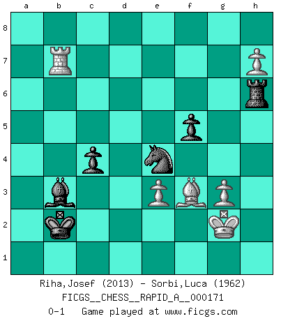 Last move : 0-1 2015 February 3 19:53:20 [Event "FICGS__CHESS__RAPID_A__000171"] [Site "FICGS"] [Date "2015.01.13"] [Round "1"] [White "Riha,Josef"] [Black "Sorbi,Luca"] [Result "0-1"] [WhiteElo "2013"] [BlackElo "1962"] 1.e4 e5 2.Nf3 Nf6 3.Nxe5 d6 4.Nf3 Nxe4 5.d4 d5 6.Bd3 Nc6 7.O-O Be7 8.c4 Nb4 9.Be2 O-O 10.Nc3 Bf5 11.a3 Nxc3 12.bxc3 Nc6 13.Re1 Re8 14.cxd5 Qxd5 15.Bf4 Rac8 16.h3 h6 17.Nd2 Na5 18.Nf1 Qb3 19.Ne3 Qxd1 20.Raxd1 Be6 21.Rb1 Bd6 22.Bh2 b6 23.Ba6 Bxh2+ 24.Kxh2 Rcd8 25.Kg3 Ba2 26.Rbc1 Bb3 27.Be2 g6 28.Rb1 Kg7 29.h4 h5 30.Bf3 c5 31.Rbc1 Ba4 32.d5 Bb3 33.Rb1 c4 34.Kh3 Nb7 35.g3 Nc5 36.Kg2 b5 37.Re2 Kf8 38.Rbe1 Rd6 39.Rd2 Red8 40.Rd4 Ra6 41.Ra1 Ke7 42.Rf4 f5 43.Rd4 Kd6 44.Rf4 Re8 45.Rd4 Ra4 46.Rd2 a5 47.Bd1 Kd7 48.d6 Rxe3 49.fxe3 b4 50.cxb4 axb4 51.Rd5 Ne4 52.Rb5 Nc3 53.Rb7+ Kxd6 54.Bf3 bxa3 55.Rb6+ Kc5 56.Rc6+ Kb4 57.Rb6+ Ka5 58.Rxg6 a2 59.Bxh5 Kb4 60.Bf3 Ka3 61.h5 Kb2 62.Rxa2+ Rxa2 63.h6 Ra7 64.Rg7 Ra6 65.h7 Rh6 66.Rb7 Ne4 0-1 Petrov : Classical attack Kingside Castling by player White (move 7) Kingside Castling by player Black (move 9) Player Black won this chess game. Follow this game move after move (download)Nowadays, when you're not a grandmaster at 14, you can forget about it. (Anand Viswanathan) Es war undenkbar für die Behörden, dass ein sowjetischer Großmeister auf diese Art und Weise [Fischer-Taimanov 6:0] verliert, ohne dass es eine politischer Erklärung dafür gäbe. (Mark Taimanov) Nunca antes ha habido un jugador de Ajedrez con tal conocimiento a fondo de las complejidades del juego y una inmensa voluntad absolutamente indomable de ganar. Yo pienso que Fischer es el jugador mas grande que jamás haya existido. (Lisa Lane) Les Echecs ont trois composantes : le temps, l'espace et le matériel en dernier. (Mikhail Tal) Luck has a peculiar habit of favoring those who don't depend on it. (Author unknown)