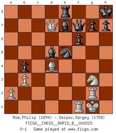 Last move : 0-1 2015 March 17 3:18:48 [Event "FICGS__CHESS__RAPID_B__000223"] [Site "FICGS"] [Date "2015.01.16"] [Round "1"] [White "Roe,Philip"] [Black "Osipov,Sergey"] [Result "0-1"] [WhiteElo "1894"] [BlackElo "1758"] 1.e4 c5 2.Nf3 d6 3.d4 cxd4 4.Nxd4 Nf6 5.Nc3 a6 6.Be3 e5 7.Nb3 Be6 8.h3 Nbd7 9.f4 Rc8 10.Qf3 exf4 11.Qxf4 Ne5 12.Be2 Ng6 13.Qg5 b5 14.Bd4 Be7 15.Qe3 b4 16.Na4 O-O 17.O-O Rxc2 18.Rad1 Nd7 19.Bxa6 Qa8 20.Bd3 Rxg2+ 21.Kxg2 Qxa4 22.Nd2 Nde5 23.b3 Qa5 24.Kh1 Nxd3 25.Qxd3 d5 26.Rf2 dxe4 27.Nxe4 Qh5 28.Bb2 Bxh3 29.Qd4 Be6 30.Rh2 Qf3+ 31.Kg1 Ne5 32.Rf1 f6 33.Rg2 Kh8 34.Rg3 Qh5 35.Qa7 Ng4 36.Rg2 Re8 37.Bd4 Bd5 38.Qd7 Ne5 39.Ng3 Qf7 0-1 Sicilian : Najdorf, Byrne (English) attack Kingside Castling by player Black (move 16) Kingside Castling by player White (move 17) Player Black won this chess game. Follow this game move after move (download)After black's reply to 1.e4 with 1..e5, leaves him always trying to get into the game. (Howard Staunton) Vom Schach wurde gesagt das Leben sei dafür nicht lange genug. Aber das ist der Fehler des Lebens, nicht des Schach'. (Irving Chernev) Yo nunca en mi vida he jugado la Defensa Francesa, que viene siendo la más aburrida de todas las Aperturas. (Wilhelm Steinitz) Les échecs, c'est l'imagination. (David Bronstein) Methinks King Thibault should dub Marius Zubac a knight of the square board... I mean table, henceforth addressing him as Sir Marius, and bestow on him a suitable land from the kingdom of FICGS & marry him off to a worthy, fair maiden, lest he slice our heads with his mighty sword in his wrath. (Dinesh De Silva)