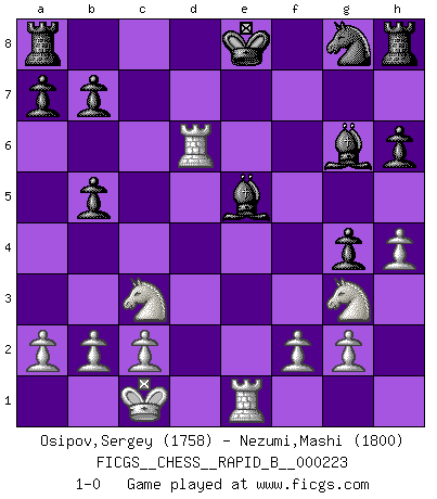 Last move : 1-0 2015 January 26 4:23:33 [Event "FICGS__CHESS__RAPID_B__000223"] [Site "FICGS"] [Date "2015.01.16"] [Round "1"] [White "Osipov,Sergey"] [Black "Nezumi,Mashi"] [Result "1-0"] [WhiteElo "1758"] [BlackElo "1800"] 1.e4 g5 2.d4 h6 3.Nc3 d6 4.h4 g4 5.Nge2 Nc6 6.Be3 e5 7.Qd2 f5 8.exf5 Bxf5 9.Ng3 Bg6 10.O-O-O Qd7 11.dxe5 Nxe5 12.Bb5 c6 13.Bf4 Bg7 14.Qxd6 Qxd6 15.Rxd6 cxb5 16.Bxe5 Bxe5 17.Re1 1-0 Reversed Grob (Borg/Basman defense/macho Grob) Queenside Castling by player White (move 10) Player White won this chess game. Follow this game move after move (download)A win by an unsound combination, however showy, fills me with artistic horror. (Wilhelm Steinitz) Es ist wirklich schade, dass so viele Schachspieler nicht auf ihr Äußeres achten! (Alexandra Kosteniuk) ¿Quién es tu oponente esta tarde? Esta tarde mi oponente son las piezas negras. (Akiba Rubinstein) Je crois qu'il existe des manières très spécifiques de jouer efficacement contre une machine. Evidemment, nous n'avons aucune chance en technique pure, parce que l'ordinateur calcule de manière parfaite. Mais lorsque nous faisons appel à notre cerveau, en utilisant l'intuition et la compréhension, alors nous restons beaucoup plus forts. (Anatoli Karpov) Success without honor is an unseasoned dish; it will satisfy your hunger, but it won't taste good. (Joe Paterno)