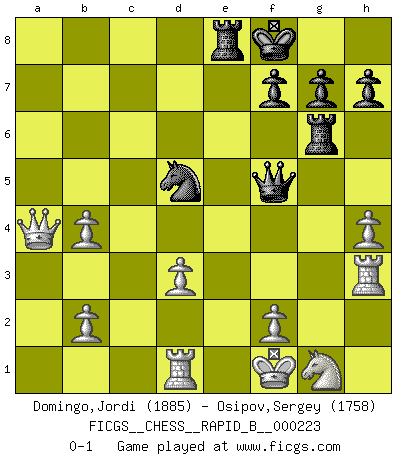 Last move : 0-1 2015 March 1 10:8:8 [Event "FICGS__CHESS__RAPID_B__000223"] [Site "FICGS"] [Date "2015.01.16"] [Round "1"] [White "Domingo,Jordi"] [Black "Osipov,Sergey"] [Result "0-1"] [WhiteElo "1885"] [BlackElo "1758"] 1.g4 d5 2.Bg2 Bxg4 3.c4 c6 4.cxd5 cxd5 5.Nc3 Nf6 6.Qb3 e6 7.Qxb7 Nbd7 8.d4 Rb8 9.Qa6 Bb4 10.Bd2 O-O 11.a3 Be7 12.Nd1 e5 13.Ba5 Qe8 14.dxe5 Nc5 15.Qxa7 Nh5 16.Bxd5 Nf4 17.Bb4 Ncd3+ 18.exd3 Bxb4+ 19.axb4 Qxe5+ 20.Ne3 Nxd5 21.Kf1 Bf5 22.Rd1 Rfe8 23.h4 Rb6 24.Nxf5 Qxf5 25.Rh3 Rg6 26.Qa4 Kf8 0-1 Grob : Fritz gambit Kingside Castling by player Black (move 10) Player Black won this chess game. Follow this game move after move (download)You sit at the board and suddenly your heart leaps. Your hand trembles to pick up the piece and move it. But what Chess teaches you is that you must sit there calmly and think about whether it's really a good idea and whether there are other better ideas. (Stanley Kubrick) Jede Eröffnung ist gut genug um gespielt zu werden, wenn nur ihr Ruf schlecht genug ist. (Savielly Grigorievitsch Tartakower) La vida es como un juego de Ajedrez, cambiando con cada movimiento. (Proverbio Chino) Soyez une menace à chaque fois que vous vous asseyez pour jouer. (Ken Smith) Life is like a ten-speed bicycle: most of us have gears we never use. (Charles M. Schulz)