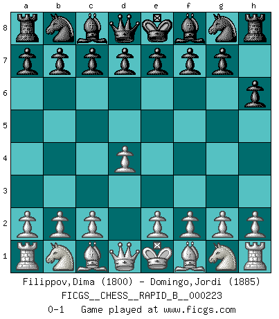 Last move : 0-1 2015 February 16 19:39:13 [Event "FICGS__CHESS__RAPID_B__000223"] [Site "FICGS"] [Date "2015.01.16"] [Round "1"] [White "Filippov,Dima"] [Black "Domingo,Jordi"] [Result "0-1"] [WhiteElo "1800"] [BlackElo "1885"] 1.d4 h6 0-1 This chess game has been lost on time (started : 2015.01.16 15:49:31) Queen's pawn Player Black won this chess game. Follow this game move after move (download)It is not a move, even the best move that you must seek, but a realizable plan. (Eugene Znosko-Borovsky) Herr Iljumschinow ist ein etwas merkwürdiger Geschäftsmann: Er arbeitet zusammen mit Leuten wie Muammar al-Gaddafi; früher ist das Saddam Hussein gewesen. (Joel Lautier) Uno no tiene que jugar muy bien, es suficiente jugar mejor que el oponente. (Siegbert Tarrasch) Roi des jeux et jeu des rois, les échecs portent en eux un sentiment d'infini. Ils donnent à celui qui s'est efforcé d'en approfondir les arcanes l'impression de n'être pas à la mesure de l'homme; en fait, ils constituent un résumé de l'univers, un microcosme, et figurent cette grande échelle qui, dans les plans de la lumière descend jusqu'à la matière, qui des abîmes insondables remonte jusqu'en l'infini de Dieu. (Pyrame) Convictions are more dangerous enemies of truth than lies. (Friedrich Nietzsche)