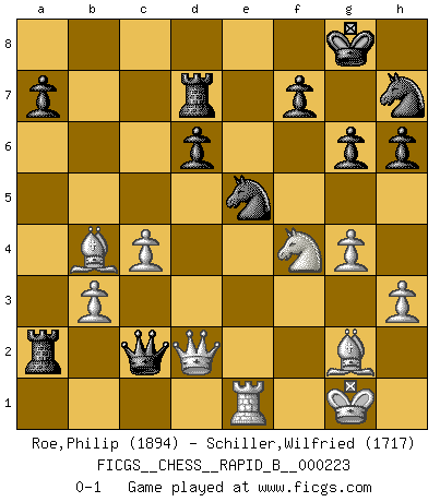 Last move : 0-1 2015 March 28 3:19:50 [Event "FICGS__CHESS__RAPID_B__000223"] [Site "FICGS"] [Date "2015.01.16"] [Round "1"] [White "Roe,Philip"] [Black "Schiller,Wilfried"] [Result "0-1"] [WhiteElo "1894"] [BlackElo "1717"] 1.e4 c5 2.Nc3 Nc6 3.Nge2 g6 4.g3 d6 5.Bg2 Nf6 6.O-O Bg7 7.d3 O-O 8.h3 Rb8 9.Be3 b5 10.Qd2 b4 11.Nd1 Qb6 12.Bg5 Qa6 13.f4 h6 14.Bh4 Rd8 15.Ne3 Nh7 16.Nc4 Be6 17.b3 Bxa1 18.Rxa1 Bxc4 19.dxc4 Qa3 20.g4 Rb6 21.Bf2 Qb2 22.Re1 e5 23.Bh4 Rd7 24.Bf2 Ra6 25.Bxc5 exf4 26.Nxf4 Rxa2 27.e5 Nxe5 28.Bxb4 Qxc2 0-1 This chess game has been lost on time (started : 2015.01.16 15:49:31) Sicilian : chameleon variation Kingside Castling by player White (move 6) Kingside Castling by player Black (move 7) Player Black won this chess game. Follow this game move after move (download)Chess problems demand from the composer the same virtues that characterize all worthwhile art: originality, invention, conciseness, harmony, complexity, and splendid insincerity. (Vladimir Nabokov) Zu meiner Zeit war ein 20 jähriger ein junger Spieler, heute ist er ein Veteran. (Garry Kasparov) Un jugador que trata de regresar una movida en el Ajedrez es un futuro carterista. (Richard Fenton) La conception d'un plan est le processus par lequel un joueur exploite les avantages de sa position tout en s'efforçant d'en réduire au minimum les inconvénients. Afin de garantir le succès, un plan doit toujours se fonder sur un diagnostic objectif des particularités d'une position. La conception d'un plan est d'autant plus difficile que la position est équilibrée, et grandement facilitée lorsqu'il n'existe qu'un seul plan susceptible de répondre aux exigences de la position. (Harry Golombek) There are two major products that came out of Berkeley: LSD and UNIX. We do not believe this is to be a coincidence. (Jeremy S. Anderson)