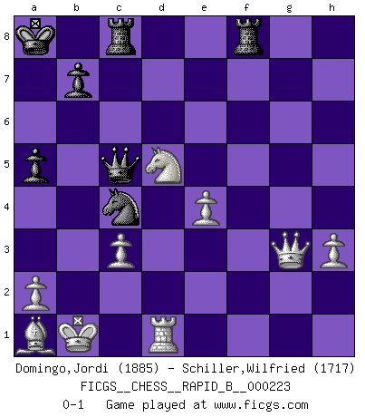 Last move : 0-1 2015 April 2 22:52:54 [Event "FICGS__CHESS__RAPID_B__000223"] [Site "FICGS"] [Date "2015.01.16"] [Round "1"] [White "Domingo,Jordi"] [Black "Schiller,Wilfried"] [Result "0-1"] [WhiteElo "1885"] [BlackElo "1717"] 1.g4 d5 2.h3 h5 3.g5 e5 4.d4 exd4 5.Qxd4 Nc6 6.Qa4 Bd7 7.Bg2 Bc5 8.Bxd5 Nd4 9.Qc4 Qe7 10.b4 Bb6 11.Be3 c6 12.Bxd4 cxd5 13.Qd3 Qxb4+ 14.Bc3 Qh4 15.e3 Qxg5 16.Ne2 Nf6 17.Rg1 Qh6 18.Nf4 O-O-O 19.Nd2 Rhe8 20.O-O-O Kb8 21.Nb3 Ne4 22.Bxg7 Qc6 23.Qe2 Bf5 24.Bb2 Nxf2 25.Nd4 Bxd4 26.Rxd4 Rc8 27.c3 Ne4 28.Nxd5 Ka8 29.Rgd1 Bg6 30.Rb4 Nc5 31.Rbd4 Be4 32.Qxh5 f5 33.Qf7 Na4 34.Ba1 Bf3 35.Qxf5 Bxd1 36.Rxd1 Nb6 37.e4 Rf8 38.Qg5 Nc4 39.Qg3 Qc5 40.Kb1 a5 0-1 Grob's attack Queenside Castling by player Black (move 18) Queenside Castling by player White (move 20) Player Black won this chess game. Follow this game move after move (download)Many have become Chess Masters, no one has become the Master of Chess. (Siegbert Tarrasch) Pläne sind die Träume des Verständigen. (Ernst Freiherr von Feuchtersleben) Todavía soy una víctima del Ajedrez. Tiene toda la belleza del arte y mucho mas. No puede ser comercializado. El Ajedrez es mas puro que el arte en su posición social. (Marcel Duchamp) D'abord les bases : Jouez et étudiez, puis étudiez et jouez, ensuite jouez et étudiez, puis étudiez et jouez. Deuxièmement : Donnez toujours le meilleur de vous-même ! (Ken Smith) Home computers are being called upon to perform many new functions, including the consumption of homework formerly eaten by the dog. (Doug Larson)