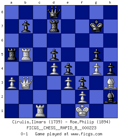 Last move : 0-1 2015 March 2 17:8:34 [Event "FICGS__CHESS__RAPID_B__000223"] [Site "FICGS"] [Date "2015.01.16"] [Round "1"] [White "Cirulis,Ilmars"] [Black "Roe,Philip"] [Result "0-1"] [WhiteElo "1739"] [BlackElo "1894"] 1.b4 e5 2.a3 d5 3.Bb2 f6 4.e3 Be6 5.Nf3 Bd6 6.c4 c6 7.Nc3 Ne7 8.cxd5 cxd5 9.Nb5 O-O 10.Be2 a5 11.bxa5 Nbc6 12.d4 e4 13.Nd2 Bb8 14.Nb3 f5 15.g3 g5 16.O-O f4 17.Bg4 Nf5 18.Bc3 f3 19.Nc5 Bc8 20.Qb3 Nfe7 21.Ne6 Bxe6 22.Bxe6+ Kg7 23.Rfc1 Rf6 24.Bg4 h5 25.Bh3 h4 26.g4 Na7 27.Kf1 Bxh2 28.Nxa7 Rxa7 29.Bb4 Nc6 30.Rc5 Rd6 31.Rac1 Rd7 32.Rb5 Nxa5 33.Bxa5 Rxa5 0-1 Polish (Sokolsky) opening Kingside Castling by player Black (move 9) Kingside Castling by player White (move 16) Player Black won this chess game. Follow this game move after move (download)In the perfect Chess combination as in a first-rate short story, the whole plot and counter-plot should lead up to a striking finale, the interest not being allayed until the very last moment. (Yates and Winter) Je mehr wir mit Computern analysieren, desto mehr glauben wir an Verteidigung. (Vladimir Kramnik) Los problemas de Ajedrez exigen del compositor las mismas virtudes que caracterizan todo el arte de valor: originalidad, invención, concisión, armonía, complejidad e insinceridad explendida. (Vladimir Nabokov) Un journaliste : 'Vous préférez avoir une dame de plus sur l'échiquier ou au lit ?' Boris Spassky : 'Ca dépend de la position.' . 'gn is not allowed in chess unless n is an integer between 1 and 8 inclusive, where 1 and 8 are to interpreted as the standard numerals standing for integers in the ordered real-closed field R, with the *canonical* ordering. (As opposed to, say, an integer in the domain Z[2+i*sqrt(5)] or an integer in some exotic Grothendieck topos). (Normajean Yates)