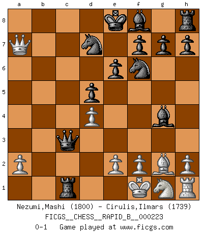 Last move : 0-1 2015 February 2 14:0:45 [Event "FICGS__CHESS__RAPID_B__000223"] [Site "FICGS"] [Date "2015.01.16"] [Round "1"] [White "Nezumi,Mashi"] [Black "Cirulis,Ilmars"] [Result "0-1"] [WhiteElo "1800"] [BlackElo "1739"] 1.g4 d5 2.Bg2 Bxg4 3.c4 c6 4.cxd5 cxd5 5.Qb3 Nf6 6.Qxb7 Nbd7 7.Nc3 e6 8.d4 Rb8 9.Qxa7 Qc8 10.Bf4 Rxb2 11.Rb1 Qxc3+ 12.Kf1 Rxb1+ 13.Bc1 Rxc1+ 0-1 Grob : Fritz gambit Player Black won this chess game. Follow this game move after move (download)Fischer is completely natural. He plays no roles. He's like a child. Very, very simple. (Zita Rajcsanyi) Im Schach gewinnt jeder. Hat man Freunde am Spiel - und das ist die Hauptsache - ist auch der Verlust einer Partie kein Unglück. (David Bronstein) Robert Fischer es la ley hacia si mismo. (Larry Evans) Karpov est une pièce de musée. (Garry Kasparov) At last I discovered the true beauty of chess. So I proposed to her. (Dinesh De Silva)
