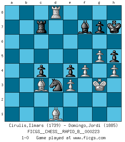 Last move : 1-0 2015 June 20 13:39:39 [Event "FICGS__CHESS__RAPID_B__000223"] [Site "FICGS"] [Date "2015.01.16"] [Round "1"] [White "Cirulis,Ilmars"] [Black "Domingo,Jordi"] [Result "1-0"] [WhiteElo "1739"] [BlackElo "1885"] 1.b4 e5 2.a3 d5 3.Bb2 Bd6 4.e3 Nf6 5.c4 dxc4 6.Bxc4 Nbd7 7.d4 O-O 8.Nd2 a5 9.b5 Qe7 10.Ne2 e4 11.Nc3 Nb6 12.h3 Be6 13.Be2 Bf5 14.g4 Bg6 15.h4 h6 16.Qb3 a4 17.Qa2 c6 18.Nc4 Nfd5 19.Nxd5 Nxd5 20.Ne5 Bxe5 21.dxe5 Nc7 22.bxc6 bxc6 23.Rc1 c5 24.Kf1 Rfd8 25.Ba1 Ne6 26.Kg2 Rab8 27.Qc4 h5 28.g5 Rd7 29.Qxa4 Ra7 30.Qc6 Rxa3 31.Rhd1 Kh7 32.Bc3 R8b3 33.Be1 Rb2 34.Rd2 Rxd2 35.Bxd2 Qd8 36.Qd6 Ra2 37.Qxd8 Nxd8 38.Rd1 Nc6 39.e6 fxe6 40.Bc4 Ra3 41.Bxe6 Ne5 42.Be1 Nd3 43.Bd5 Ra7 44.Kg3 Ra4 45.Bc3 Ra3 46.Ba1 Ra7 47.Rb1 Nb4 48.Be6 Re7 49.Bc4 Bf7 50.Bf1 Bg6 51.Bc3 Nd3 52.Rb5 Rd7 53.Be2 c4 54.Rb6 Rc7 55.Rd6 Nc1 56.Bd1 Nd3 57.Rd8 Bf7 58.f4 1-0 This chess game has been lost on time (started : 2015.01.16 15:49:31) Polish (Sokolsky) opening Kingside Castling by player Black (move 7) Player White won this chess game. Follow this game move after move (download)The sign of a great Master is his ability to win a won game quickly and painlessly. (Irving Chernev) Drei Punkte vor allen anderen ist wie einer, der im weißen Anzug posiert, während der Rest in Müllsäcke gekleidet dasteht. (Viktor Kortschnoi) Por tratar de evitar la pérdida de una pieza, muchas personas han perdido una partida de Ajedrez. (Savielly Tartakover) Le pion, dans sa simplicité, marche droit devant lui, mais lorsqu'il prend, il le fait obliquement? Ainsi l'homme, tant qu'il reste pauvre, marche dans la droiture et vit honnêtement, mais lorsqu'il recherche les honneurs, il flatte, se parjure et, par les voies obliques, cherche une position supérieure sur l'échiquier du monde. (Jean de Galles) Art is the triumph over chaos. (John Cheever)