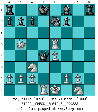 Last move : 1-0 2015 January 19 18:33:11 [Event "FICGS__CHESS__RAPID_B__000223"] [Site "FICGS"] [Date "2015.01.16"] [Round "1"] [White "Roe,Philip"] [Black "Nezumi,Mashi"] [Result "1-0"] [WhiteElo "1894"] [BlackElo "1800"] 1.Nc3 g5 2.e4 d6 3.d4 g4 4.h3 h5 5.hxg4 Bxg4 6.Be2 Bxe2 7.Qxe2 Nc6 8.Be3 e5 9.dxe5 dxe5 10.Rxh5 Nd4 11.Rxe5+ Ne7 12.Bxd4 Qxd4 13.Qb5+ Kd8 14.Rd1 1-0 Dunst (Sleipner, Heinrichsen) Opening Player White won this chess game. Follow this game move after move (download)Chess is above all, a fight ! (Emanuel Lasker) Ein Kibitz ist einer, der deinem Gegner gute Ratschläge gibt. (Andrew Soltis) Aquellos que dicen entender al Ajedrez, no entienden nada. (Robert Hubner) Les Echecs représentent une sphère d'idées créatrices basée sur la volonté des deux protagonistes. (Smyslov) The various flowers seem good to different people. (Chinese proverb)