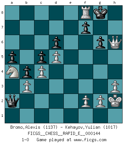 Last move : 1-0 2015 January 27 20:48:0 [Event "FICGS__CHESS__RAPID_E__000144"] [Site "FICGS"] [Date "2015.01.17"] [Round "1"] [White "Bromo,Alexis"] [Black "Kehayov,Yulian"] [Result "1-0"] [WhiteElo "1137"] [BlackElo "1017"] 1.d4 d6 2.c4 e5 3.Nc3 Be7 4.h3 Nf6 5.Bg5 h6 6.Bh4 O-O 7.e3 exd4 8.exd4 c6 9.Nf3 Re8 10.Be2 a6 11.O-O b5 12.b3 b4 13.Na4 a5 14.Re1 c5 15.d5 Nh7 16.Bd3 Bxh4 17.Nxh4 Qxh4 18.Rxe8+ Nf8 19.Rxc8 Qe7 20.Qd2 Qb7 21.Re8 Nbd7 22.Rxa8 Qxa8 23.Re1 Qd8 24.Bf5 g6 25.Bxd7 Qxd7 26.Qxh6 Qf5 27.Re8 Qb1+ 28.Kh2 Qxa2 29.Rxf8+ 1-0 Old Indian defense Kingside Castling by player Black (move 6) Kingside Castling by player White (move 11) Player White won this chess game. Follow this game move after move (download)Could we look into the head of a Chess player, we should see there a whole world of feelings, images, ideas, emotion and passion. (Alfred Binet) Es hat in meinem Leben Zeiten gegeben, in denen das Schachspiel, wenn nicht zum Lebenszweck, so doch zu einem regelrechten Lebensersatz geworden ist. Man fühlt sich in solchen Zeiten nicht so, als besäße man eine göttliche Gabe, sondern eher so, als sei man von ihr besessen. (Garry Kasparov) Cada Peón es potencialmente una Reina. (James Mason) Si rien de grave n'est détecté lors de l'analyse d'une position, on joue alors le coup. Seconde règle de Blumenfeld. Programmer - an organism that turns coffee into software. (Anonymous)