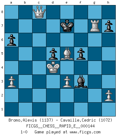 Last move : 1-0 2015 January 22 20:42:25 [Event "FICGS__CHESS__RAPID_E__000144"] [Site "FICGS"] [Date "2015.01.17"] [Round "1"] [White "Bromo,Alexis"] [Black "Cavaille,Cedric"] [Result "1-0"] [WhiteElo "1137"] [BlackElo "1072"] 1.d4 e6 2.c4 c5 3.Nc3 cxd4 4.Qxd4 Nc6 5.Qd1 Bb4 6.Bd2 Nf6 7.a3 Bxc3 8.Bxc3 d6 9.Nf3 d5 10.e3 dxc4 11.Qxd8+ Nxd8 12.Bxc4 Nd5 13.Bxd5 exd5 14.Bxg7 Rg8 15.Bf6 Rxg2 16.Rg1 Rxg1+ 17.Nxg1 Be6 18.Nf3 Rc8 19.Kd2 Bf5 20.Rg1 Bg6 21.Ne5 Nc6 22.Nxc6 bxc6 23.b4 Kd7 24.Kc3 a6 25.Kd4 Kd6 26.f3 c5+ 27.bxc5+ Ke6 28.Be5 f6 29.Bd6 Rb8 30.Bxb8 f5 31.c6 Bh5 32.c7 Bxf3 33.c8Q+ Kf6 34.Be5+ Ke7 35.Rg7+ 1-0 Queen's pawn Promotion Queen by player White (move 33) Player White won this chess game. Follow this game move after move (download)The tactician must know what to do whenever something needs doing; the strategist must know what to do when nothing needs doing. (Savielly Tartakover) Dein Körper muss in Topform sein. Dein Schach verfällt, wenn dein Körper verfällt. Der Körper kann nicht vom Geist getrennt werden. (Robert James Fischer) Botvinnik trató de alejar el misterio referente al Ajedrez, siempre relacionandolo a situaciones de la vida diaria. Solía llamar al Ajedrez un problema inexacto típico, similar a aquellos en que la gente tiene siempre que resolver a cada día. (Garry Kasparov) Soyez une menace à chaque fois que vous vous asseyez pour jouer. (Ken Smith) Live, lose, and learn, by observing your opponent how to win. (Amber Steenbock)