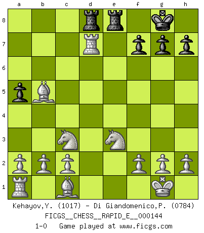 Last move : 1-0 2015 February 28 18:57:28 [Event "FICGS__CHESS__RAPID_E__000144"] [Site "FICGS"] [Date "2015.01.17"] [Round "1"] [White "Kehayov,Yulian"] [Black "Di Giandomenico,Pierino"] [Result "1-0"] [WhiteElo "1017"] [BlackElo "0784"] 1.e4 e5 2.Nf3 d6 3.d4 Bg4 4.Be2 c5 5.dxc5 dxc5 6.Nxe5 Bd6 7.Bxg4 Nf6 8.Nc4 Nxe4 9.O-O O-O 10.Bf3 Nf6 11.Qxd6 Nc6 12.Qxc5 Rc8 13.Nc3 b6 14.Qe3 Re8 15.Qd2 b5 16.Ne3 a5 17.Qxd8 Rcxd8 18.Bxc6 Re6 19.Bxb5 Nd7 20.Rd1 R6e8 21.Rxd7 1-0 Philidor's defense Kingside Castling by player White (move 9) Kingside Castling by player Black (move 9) Player White won this chess game. Follow this game move after move (download)I'd rather have a Pawn than a finger. (Reuben Fine) Obwohl ich alt bin, darf mir niemand den Finger in den Mund stecken, sonst beisse ich. (Wilhelm Steinitz) Bendita sea la memoria de aquel que dio al mundo este juego inmortal. (A. G. Gardiner) J'apprécie les joueurs d'est-indienne, c'est grâce à eux que je nourris ma famille depuis tant d'années. (Petrosian) The ego is not master in its own house. (Sigmund Freud)