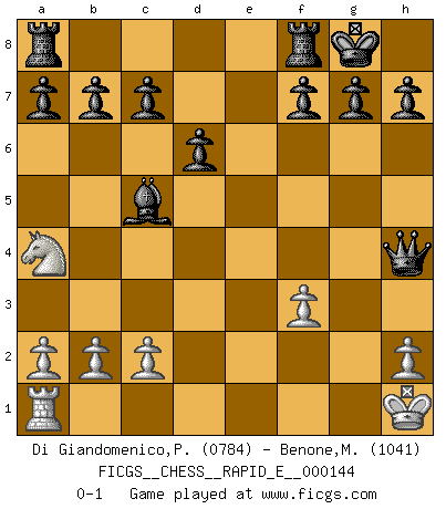 Last move : 0-1 2015 February 28 18:58:28 [Event "FICGS__CHESS__RAPID_E__000144"] [Site "FICGS"] [Date "2015.01.17"] [Round "1"] [White "Di Giandomenico,Pierino"] [Black "Benone,Mateia"] [Result "0-1"] [WhiteElo "0784"] [BlackElo "1041"] 1.e4 e5 2.d3 Nc6 3.Nf3 Nf6 4.d4 Nxe4 5.dxe5 Bc5 6.Bd3 Nxf2 7.O-O Nxd1 8.Kh1 Nf2+ 9.Kg1 Nxd3 10.Kh1 Nxc1 11.Rxc1 O-O 12.Nc3 d6 13.Rd1 Bg4 14.Rf1 Bxf3 15.Rxf3 Nxe5 16.Na4 Nxf3 17.gxf3 Qh4 0-1 Variation Indian Opening : Indian Opening Kingside Castling by player White (move 7) Kingside Castling by player Black (move 11) Player Black won this chess game. Follow this game move after move (download)I like to say that Bobby Fischer was the greatest player ever. But what made Fischer a genius was his ability to blend an American freshness and pragmatism with Russian ideas about strategy. (Bruce Pandolfini) Gott hat gewollt, dass ich Champion werde. (Surab Azmajparaschvili) El Ajedrez era la lengua materna de Capablanca. (Reti) Le moment que je préfère le plus dans une rencontre, c'est celui où je sens que la personnalité de l'adversaire se brise. (Robert Fischer) In fact if nothing is done against this teddy bear, hereby I announce that I would quit chess, rapid chess, blitz chess, postal chess, email chess, server chess and correspondence chess I will then switch to a table game where teddy bears aren't going to be seen for a while, like Poker, or Roulette, all 18+ games. (Elmer Valderrama)