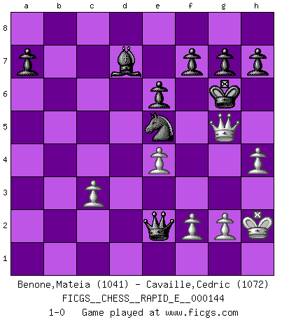 Last move : 1-0 2015 February 2 18:2:0 [Event "FICGS__CHESS__RAPID_E__000144"] [Site "FICGS"] [Date "2015.01.17"] [Round "1"] [White "Benone,Mateia"] [Black "Cavaille,Cedric"] [Result "1-0"] [WhiteElo "1041"] [BlackElo "1072"] 1.Nf3 c5 2.c4 e6 3.Nc3 Nf6 4.d4 cxd4 5.Nxd4 d5 6.cxd5 Nxd5 7.e4 Nxc3 8.bxc3 Bc5 9.Be3 Bd7 10.Qb3 b6 11.Rd1 Qc7 12.Be2 Nc6 13.Nb5 Qb8 14.Bxc5 bxc5 15.Nd6+ Ke7 16.Qc2 Rd8 17.O-O Be8 18.Kh1 Rxd6 19.Rxd6 Qxd6 20.Rd1 Qf4 21.Bf3 Rd8 22.Rxd8 Nxd8 23.h3 Nc6 24.Qb3 Bd7 25.Qc4 Qc1+ 26.Kh2 Ne5 27.Qxc5+ Kf6 28.Be2 Qc2 29.Qe3 Qxa2 30.Qf4+ Kg6 31.h4 Qxe2 32.Qg5+ 1-0 Reti Opening Kingside Castling by player White (move 17) Player White won this chess game. Follow this game move after move (download)In a gambit you give up a Pawn for the sake of getting a lost game. (Samuel Standige Boden) Es macht mich traurig, wenn ich sehe, dass Golfprofis mehr verdienen als Schachsportler. Obwohl ich davon überzeugt bin, dass wir Schachspieler viel härter trainieren müssen als die Golfer. (Alexandra Kosteniuk) El Ajedrez es un regaderazo frío para la mente. (Sir John Simon) D'abord les bases : Jouez et étudiez, puis étudiez et jouez, ensuite jouez et étudiez, puis étudiez et jouez. Deuxièmement : Donnez toujours le meilleur de vous-même ! (Ken Smith) To err is human, but to really foul things up requires a computer. (Farmer's Almanac, 1978)