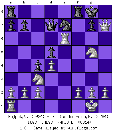 Last move : 1-0 2015 March 1 12:29:30 [Event "FICGS__CHESS__RAPID_E__000144"] [Site "FICGS"] [Date "2015.01.17"] [Round "1"] [White "Rajput,Vishalsingh"] [Black "Di Giandomenico,Pierino"] [Result "1-0"] [WhiteElo "0924"] [BlackElo "0784"] 1.e4 e5 2.Nf3 d6 3.Bc4 Be6 4.Bxe6 fxe6 5.O-O Nf6 6.Re1 Nxe4 7.Rxe4 d5 8.Rxe5 Qd6 9.d4 Be7 10.Bg5 Nc6 11.Bxe7 Nxe7 12.Nc3 O-O 13.Ng5 c5 14.Rxe6 Qd7 15.Qd3 c4 16.Qxh7+ 1-0 Philidor's defense Kingside Castling by player White (move 5) Kingside Castling by player Black (move 12) Player White won this chess game. Follow this game move after move (download)A man without frontiers. He didn't divide the East and the West, he brought them together in their admiration for him. (Ljubomir Ljubojevic, about Bobby Fischer's death) Ich bin es gewohnt, das die Jugend mir überhaupt keinen Respekt entgegenbringt. (Alexander Morozewich) Las piezas de Ajedrez son los bloques del alfabeto que moldean los pensamientos; y esos pensamientos, aunque hagan un diseño visual en el tablero, expresan abstractamente su belleza como un poema. (Marcel Duchamp) La tactique, c'est ce que vous faites quand il y a quelque chose à faire; la stratégie, c'est ce que vous faites quand il n'y a rien à faire. (Savielli Tartacower) Horse racing is animated roulette. (Roger Kahn)