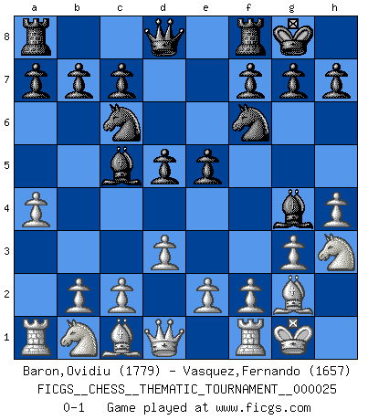 Last move : 0-1 2007 April 2 7:25:34 [Event "FICGS__CHESS__THEMATIC_TOURNAMENT__000025"] [Site "FICGS"] [Date "2007.02.28"] [Round "1"] [White "Baron,Ovidiu"] [Black "Vasquez,Fernando"] [Result "0-1"] [WhiteElo "1779"] [BlackElo "1657"] 1.a4 e5 2.h4 d5 3.g3 Nc6 4.Bg2 Nf6 5.d3 Bc5 6.Nh3 O-O 7.O-O Bg4 0-1 Crab Opening Kingside Castling by player Black (move 6) Kingside Castling by player White (move 7) Player Black won this chess game. Follow this game move after move (download)Chess is a beautiful mistress. (Bent Larsen) Ein bischen Romantik kann weder im Schach noch in der Liebe schaden. Also versuche ich mich ab und zu daran zu erinnern. (Nigel Short) El Ajedrez era la lengua materna de Capablanca. (Reti) Fischer est le meilleur joueur du monde et Karpov n'est qu'un joueur de bistrot. (Garry Kasparov, agé de 16 ans) Real knowledge is to know the extent of one's ignorance. (Confucius)