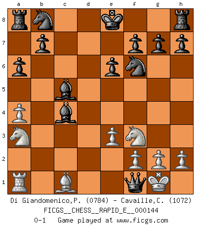 Last move : 0-1 2015 February 7 10:0:52 [Event "FICGS__CHESS__RAPID_E__000144"] [Site "FICGS"] [Date "2015.01.17"] [Round "1"] [White "Di Giandomenico,Pierino"] [Black "Cavaille,Cedric"] [Result "0-1"] [WhiteElo "0784"] [BlackElo "1072"] 1.d4 e6 2.Nf3 d5 3.e3 c5 4.dxc5 Bxc5 5.Bb5+ Bd7 6.Qd3 Nf6 7.O-O a6 8.Ba4 Bxa4 9.b3 Bb5 10.c4 dxc4 11.bxc4 Qxd3 12.a4 Bxc4 13.Na3 Qxf1+ 0-1 Queen's pawn Kingside Castling by player White (move 7) Player Black won this chess game. Follow this game move after move (download)The winner of the game is the player who makes the next-to-last mistake. (Savielly Tartakover) Konzentriere dich auf materielle Gewinne. Nimm, was dir dein Gegner gibt, ausser es gibt einen guten Grund der dagegenspricht. (Robert James Fischer) Nos gusta pensar. (Gary Kasparov) Même un GMI sait rarement calculer sur plus de cinq coups une attaque à sacrifices. (Rudolf Spielmann) This is where the fun begins. (Anakin Skywalker in Star Wars ep.3)