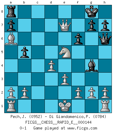 Last move : 0-1 2015 April 23 8:6:51 [Event "FICGS__CHESS__RAPID_E__000144"] [Site "FICGS"] [Date "2015.01.17"] [Round "1"] [White "Pech,Jaroslav"] [Black "Di Giandomenico,Pierino"] [Result "0-1"] [WhiteElo "0952"] [BlackElo "0784"] 1.d4 d5 2.c4 e6 3.Nc3 Nf6 4.Bg5 Bb4 5.Nf3 O-O 6.e3 Bd7 7.cxd5 exd5 8.Qb3 Na6 9.Bxa6 b6 10.Qxb4 Re8 11.Bxf6 Qxf6 12.Nxd5 Qh6 13.Nxc7 b5 14.Nxa8 Rxa8 15.Qe7 Bg4 16.Ne5 f6 0-1 This chess game has been lost on time (started : 2015.01.17 2:24:12) QGD : 4.Bg5 Kingside Castling by player Black (move 5) Player Black won this chess game. Follow this game move after move (download)He who takes the Queen's Knight's Pawn will sleep in the streets. (Anonymous) Das ganze Leben mit einer Ehefrau ist wie ein Endspiel mit ungleichfarbigen Läufern. (Viktor Kortschnoi) Dios mío, Bobby Fischer juega tan simple. (Alexei Suetin) Je ne crois pas en la psychologie, je crois aux bons coups. (Robert Fischer) A belief is an idea the mind possesses, an idea that possesses the mind. (Robert Oxden Bolton)