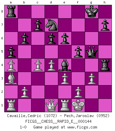 Last move : 1-0 2015 April 22 19:58:26 [Event "FICGS__CHESS__RAPID_E__000144"] [Site "FICGS"] [Date "2015.01.17"] [Round "1"] [White "Cavaille,Cedric"] [Black "Pech,Jaroslav"] [Result "1-0"] [WhiteElo "1072"] [BlackElo "0952"] 1.d4 f5 2.c4 Nf6 3.Nf3 e6 4.Nc3 Bb4 5.Bd2 O-O 6.e3 b6 7.Be2 Bb7 8.O-O Bxc3 9.Bxc3 Ne4 10.Bb4 d6 11.Bd3 Nd7 12.a4 a5 13.Ba3 Rf6 14.h3 Rg6 15.g3 Rh6 16.h4 g5 17.Bxe4 Bxe4 18.Nxg5 Qxg5 19.Re1 Rxh4 20.Kf1 1-0 This chess game has been lost on time (started : 2015.01.17 2:24:12) Dutch defense Kingside Castling by player Black (move 5) Kingside Castling by player White (move 8) Player White won this chess game. Follow this game move after move (download)I still hope to kill Fischer. (Boris Spassky) Irgendwie scheint mir sonntags früh um 9 Uhr der Killerinstinkt verloren gegangen zu sein. (Alexej Shirov) La esencia del Ajedrez es pensar acerca de lo que el Ajedrez es. (David Bronstein) Si rien de grave n'est détecté lors de l'analyse d'une position, on joue alors le coup. Seconde règle de Blumenfeld. It's not a bug - it's an undocumented feature. (Anonymous)