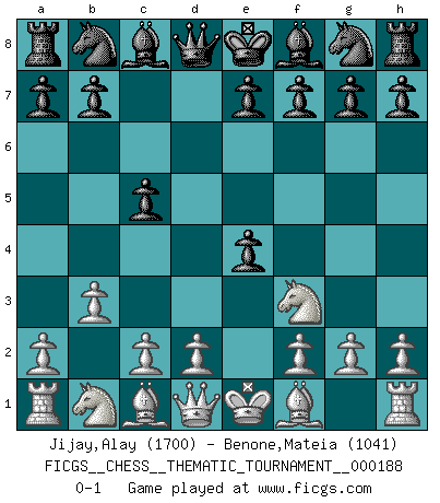 Last move : 0-1 2015 February 27 23:42:22 [Event "FICGS__CHESS__THEMATIC_TOURNAMENT__000188"] [Site "FICGS"] [Date "2015.01.18"] [Round "1"] [White "Jijay,Alay"] [Black "Benone,Mateia"] [Result "0-1"] [WhiteElo "1700"] [BlackElo "1041"] 1.Nf3 d5 2.b3 c5 3.e4 dxe4 0-1 This chess game has been lost on time (started : 2015.01.18 15:12:44) Reti : Nimzovich-Larsen attack Player Black won this chess game. Follow this game move after move (download)Who is your opponent tonight, tonight I am playing against the Black pieces. (Akiba Rubinstein) Zu meiner Zeit war ein 20 jähriger ein junger Spieler, heute ist er ein Veteran. (Garry Kasparov) En partidas rápidas, el Caballo es mas poderoso que el Alfil. (Vlastimil Hort) La vérité est comme le meilleur coup aux échecs : elle existe, mais il faut la chercher. (Arturo Perez-Reverte) Secret operations are essential in war; upon them the army relies to make its every move. (Sun Tzu)