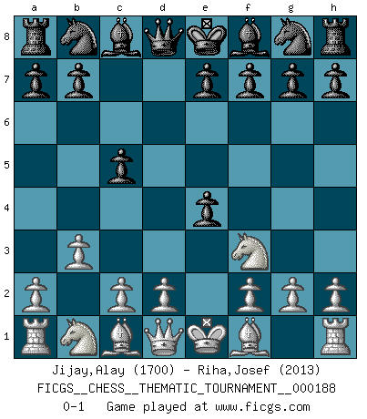 Last move : 0-1 2015 February 27 23:42:22 [Event "FICGS__CHESS__THEMATIC_TOURNAMENT__000188"] [Site "FICGS"] [Date "2015.01.18"] [Round "1"] [White "Jijay,Alay"] [Black "Riha,Josef"] [Result "0-1"] [WhiteElo "1700"] [BlackElo "2013"] 1.Nf3 d5 2.b3 c5 3.e4 dxe4 0-1 This chess game has been lost on time (started : 2015.01.18 15:12:44) Reti : Nimzovich-Larsen attack Player Black won this chess game. Follow this game move after move (download)Chess is a terrible game. If you have no center, your opponent has a freer position. If you do have a center, then you really have something to worry about ! (Siegbert Tarrasch) Pläne sind die Träume des Verständigen. (Ernst Freiherr von Feuchtersleben) Bendita sea la memoria de aquel que dio al mundo este juego inmortal. (A. G. Gardiner) On a dit que l'homme se distingue de l'animal par le fait qu'il achète plus de livres qu'il ne peut en lire. Je voudrais suggérer qu'inclure à la liste des livres quelques livres d'échecs rendrait la distinction manifeste. (Edward Lasker) Indecision is the key to flexibility. (Unknown)