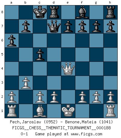Last move : 0-1 2015 May 28 23:28:39 [Event "FICGS__CHESS__THEMATIC_TOURNAMENT__000188"] [Site "FICGS"] [Date "2015.01.18"] [Round "1"] [White "Pech,Jaroslav"] [Black "Benone,Mateia"] [Result "0-1"] [WhiteElo "0952"] [BlackElo "1041"] 1.Nf3 d5 2.b3 c5 3.e4 dxe4 4.Ng5 Nf6 5.Nc3 Bf5 6.Bb5+ Nbd7 7.Qe2 a6 8.Ngxe4 Nxe4 9.Nxe4 Bxe4 10.Bxd7+ Qxd7 11.Qxe4 O-O-O 0-1 This chess game has been lost on time (started : 2015.01.18 15:12:44) Reti : Nimzovich-Larsen attack Queenside Castling by player Black (move 11) Player Black won this chess game. Follow this game move after move (download)Suddenly it was obvious to me in my analysis I had missed what Fischer had found with the greatest of ease at the board. (Mikhail Botvinnik) Der Knackpunkt bei der Konzentration ist, daß wir nur durch sie etwas Neues und Ungewöhnliches am Schachbrett finden können. Sie ist der einzige Weg durch neue neue Ideen eine Überraschung zu bereiten. (Garry Kasparov) Las piezas de Ajedrez son los bloques del alfabeto que moldean los pensamientos; y esos pensamientos, aunque hagan un diseño visual en el tablero, expresan abstractamente su belleza como un poema. (Marcel Duchamp) Dieu déplace le joueur, et celui-ci la pièce. Quel Dieu derrière Dieu commence donc la trame ? Arturo Perez-Reverte (prix de littérature policière 1993). Only sick music makes money today. (Friedrich Nietzsche)