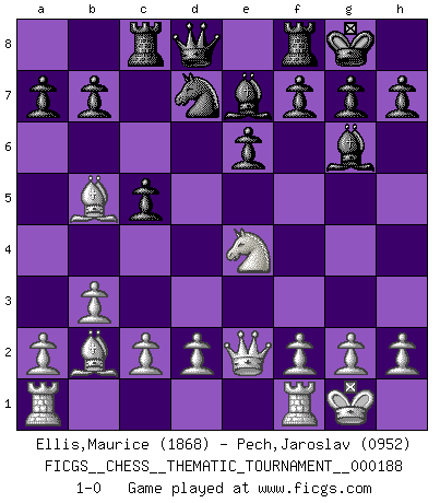 Last move : 1-0 2015 May 30 9:53:40 [Event "FICGS__CHESS__THEMATIC_TOURNAMENT__000188"] [Site "FICGS"] [Date "2015.01.18"] [Round "1"] [White "Ellis,Maurice"] [Black "Pech,Jaroslav"] [Result "1-0"] [WhiteElo "1868"] [BlackElo "0952"] 1.Nf3 d5 2.b3 c5 3.e4 dxe4 4.Ng5 Nf6 5.Nc3 Bf5 6.Bb5+ Nbd7 7.Qe2 e6 8.Ngxe4 Be7 9.O-O O-O 10.Bb2 Rc8 11.Ng3 Bg6 12.Nce4 Nxe4 13.Nxe4 1-0 Reti : Nimzovich-Larsen attack Kingside Castling by player White (move 9) Kingside Castling by player Black (move 9) Player White won this chess game. Follow this game move after move (download)Nonsense was the last thing Fischer was interested in, as far as Chess was concerned. (Elie Agur) Schach ist wie eine schöne Frau, zu der wir ständig zurückkehren, gleichviel, wie oft sie uns zurückweist. (Anonymous) Es muy difícil jugar en contra de la teoría de Einstein. - en su primera derrota en contra de Fischer (Mikhail Tal) Les Echecs sont et restent toujours un combat, un combat intégral comme la boxe, la lutte ou un autre sport, et où il doit y avoir un vainqueur et un vaincu. (Joseph Emil Diemer) The best teachers teach from the heart, not from the book. (Author unknown)